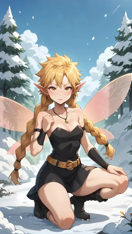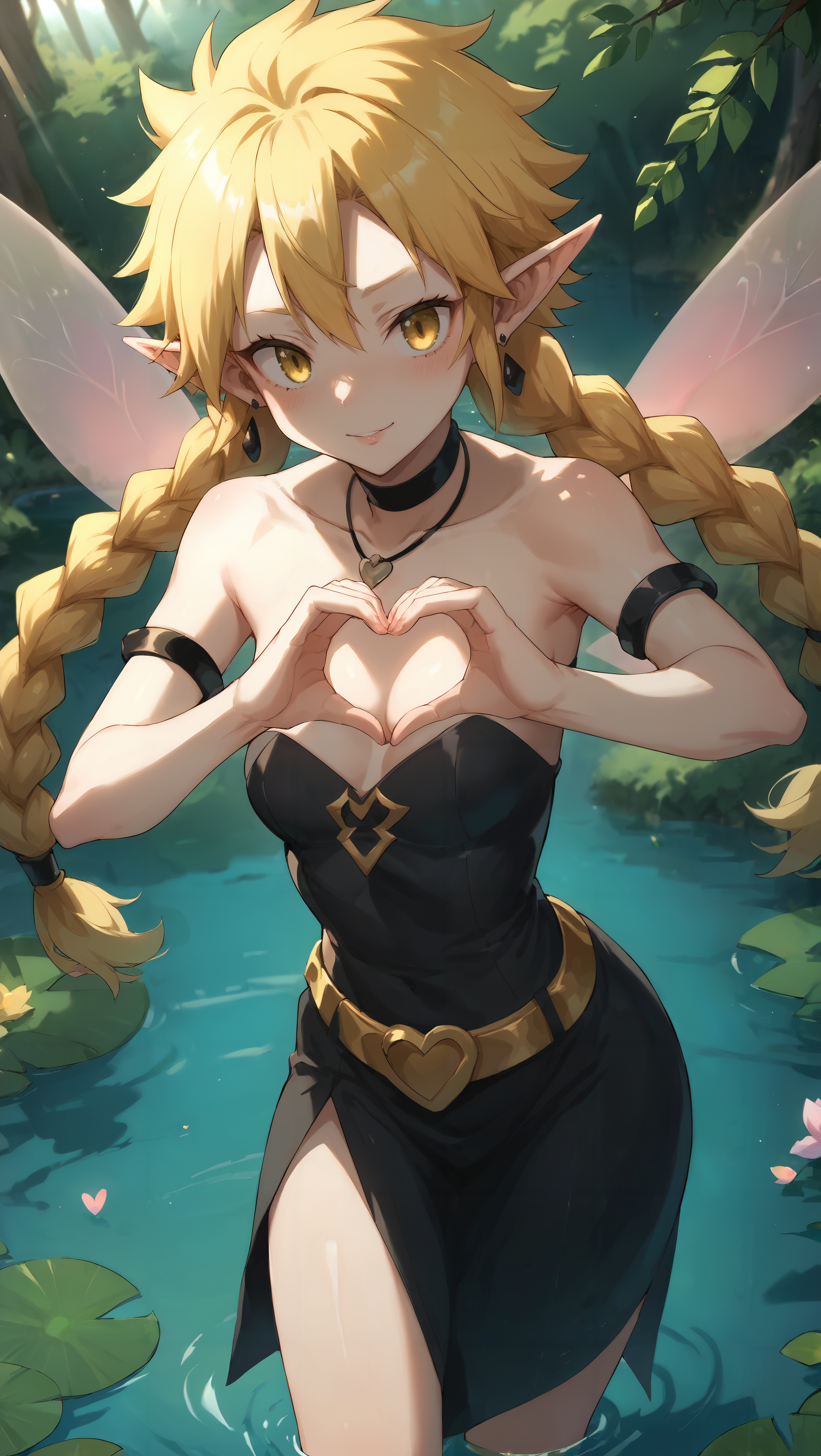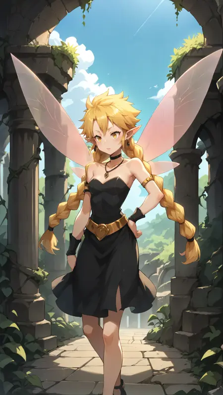 fairy, black dress, strapless dress, blonde hair, twin braids, long braids, gold belt, black armguards, armlets, yellow eyes, fairy wings