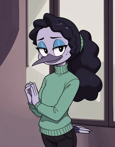 violet sabrewing, hummingbird, beak, purple skin, black eyes, blue eyeshadow, ponytail, curled hair, black hair, beak, freckles, eyelashes, purple legs, 2 toes, avian feet, beak, tail feathers