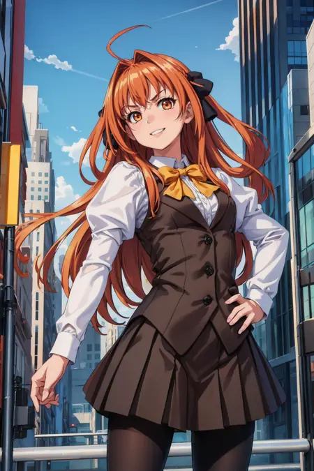 通常の外見には、「defCorticarte, hair ribbon, yellow bow, white shirt, long sleeves, black vest, black skirt, black pantyhose」を追加してください。