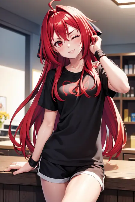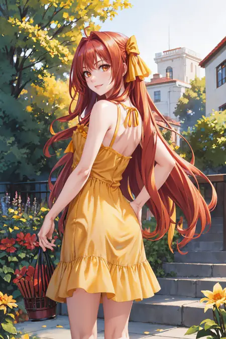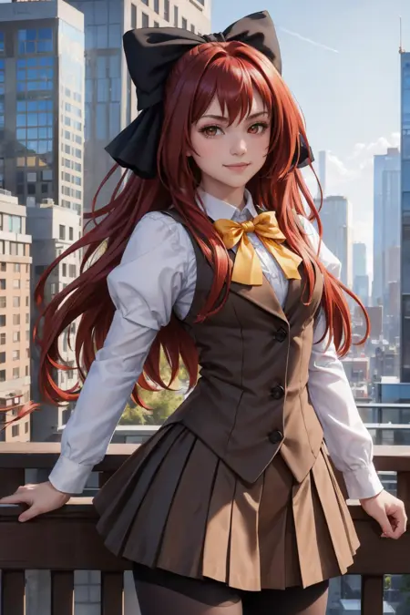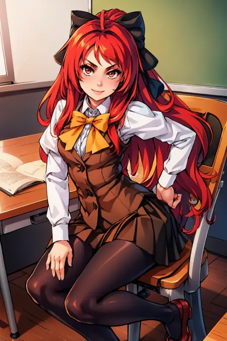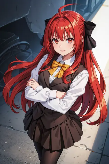 Add "defCorticarte, hair ribbon, yellow bow, white shirt, long sleeves, black vest, black skirt, black pantyhose" for her regular look.