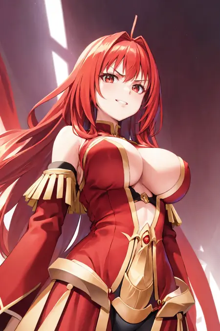 代替の外見には、「altCorticarte, red dress, center opening, cleavage, large breasts, detached sleeves, black thighhighs」を追加してください。