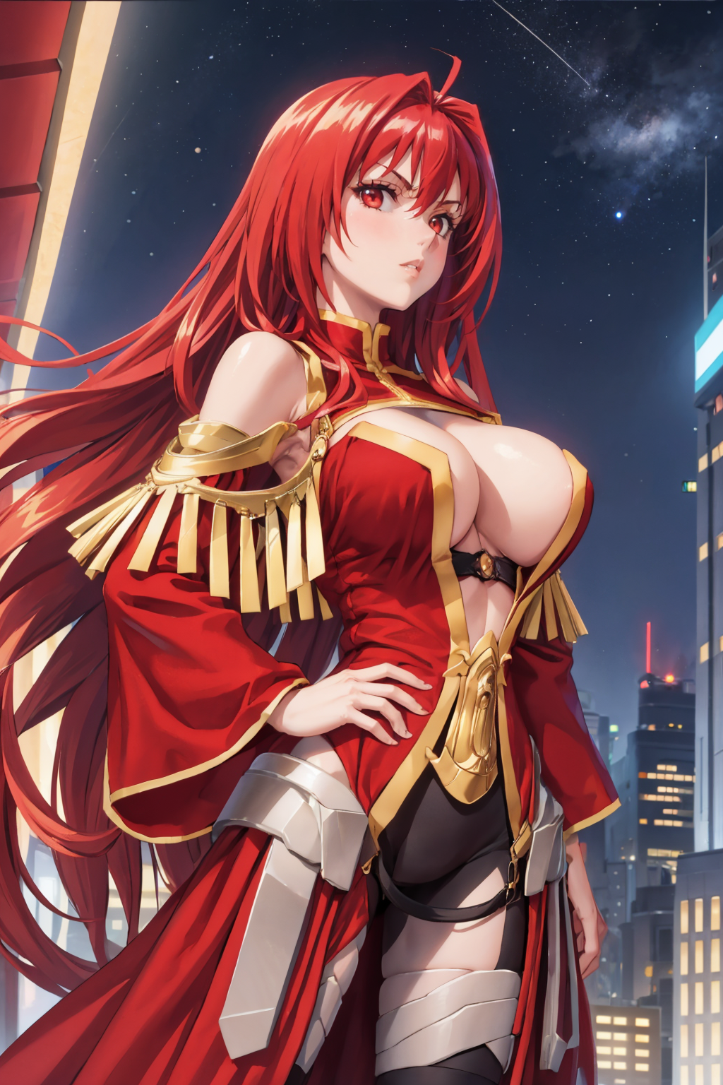 Add "altCorticarte, red dress, center opening, cleavage, large breasts, detached sleeves, black thighhighs" for her alternate look.