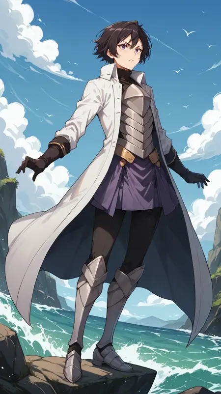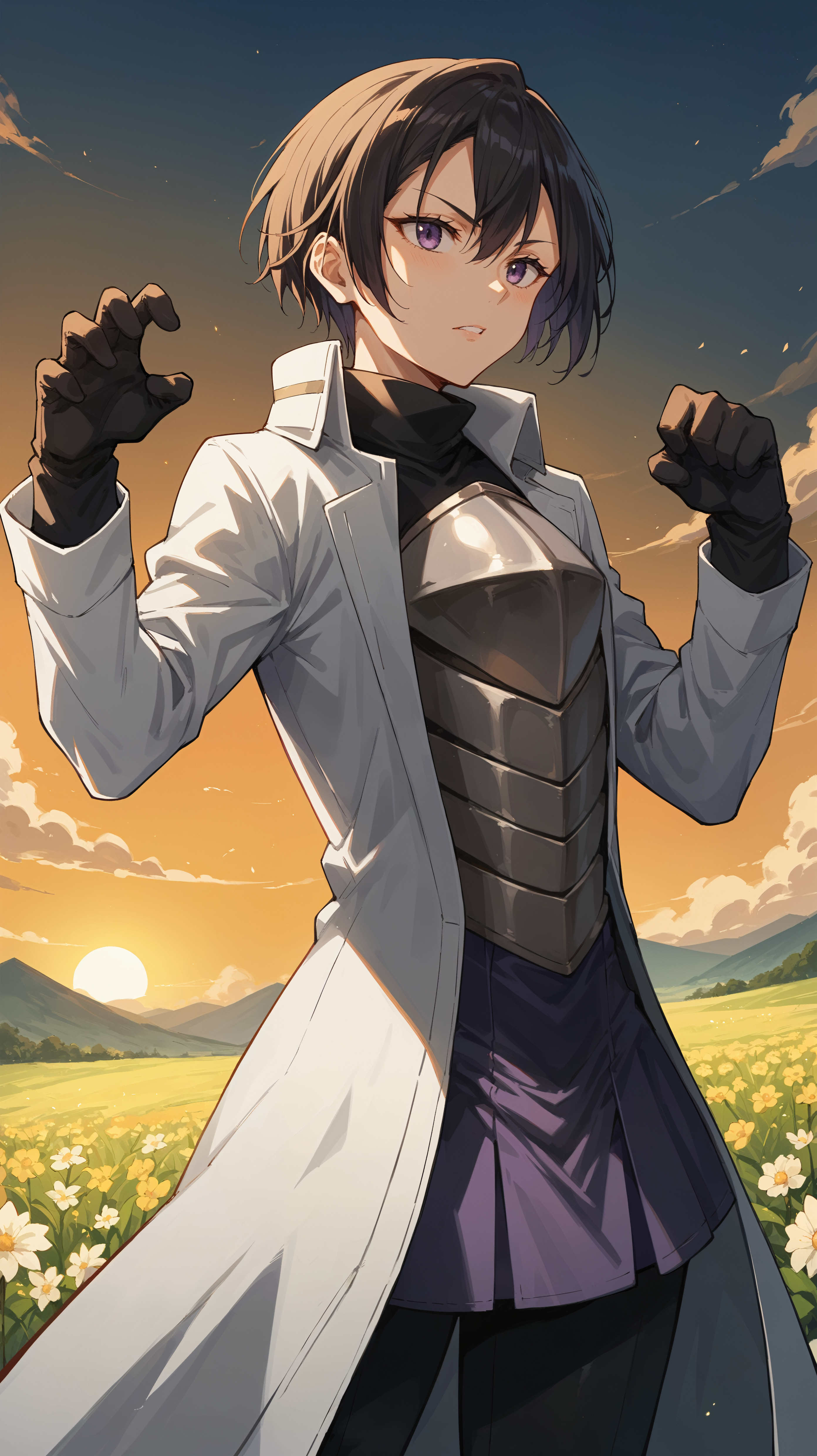 white coat, long coat, steel breastplate, black pants, purple skirt, short hair, black hair, purple eyes, high collar, black gloves,