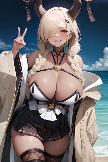 Character trigger : azlnowari, mole under mouth, huge breasts, very long hair, low twin braids, hair ornament, earrings