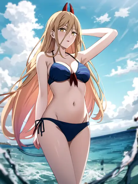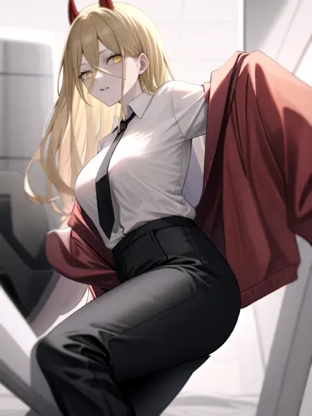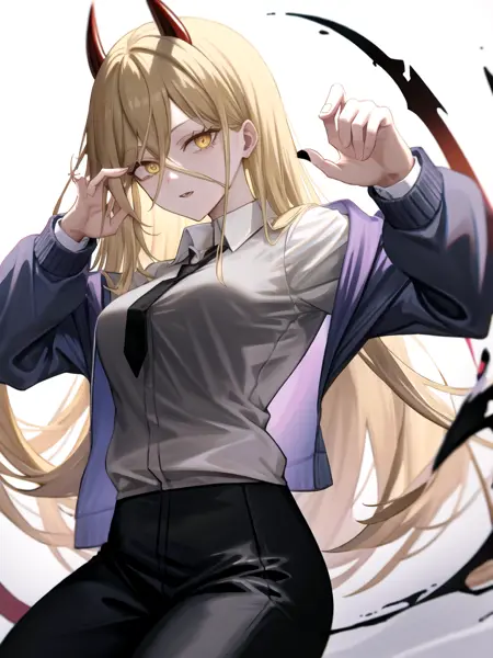 노란 눈, 금발, 빨간 뿔, 재킷, 흰색 셔츠, 바지