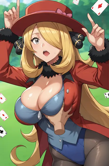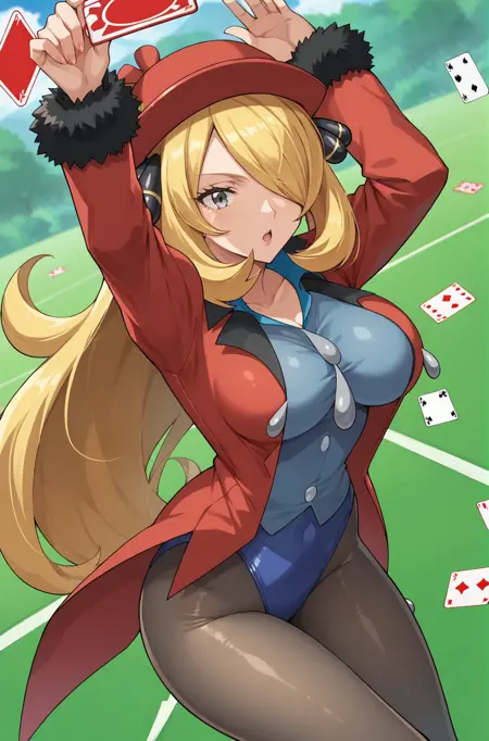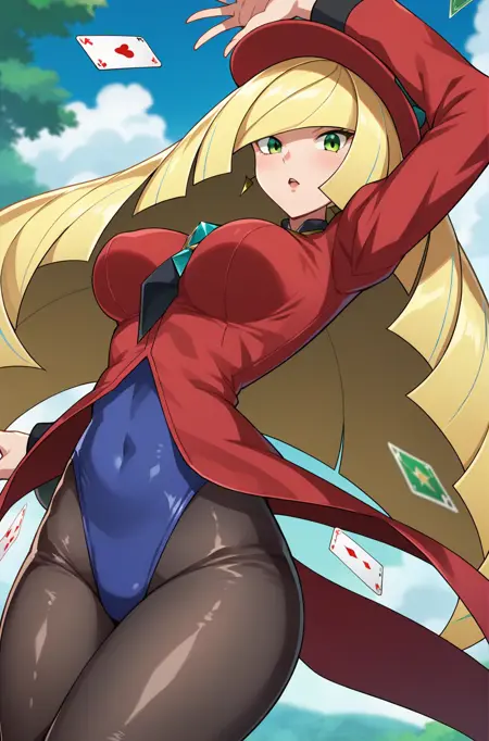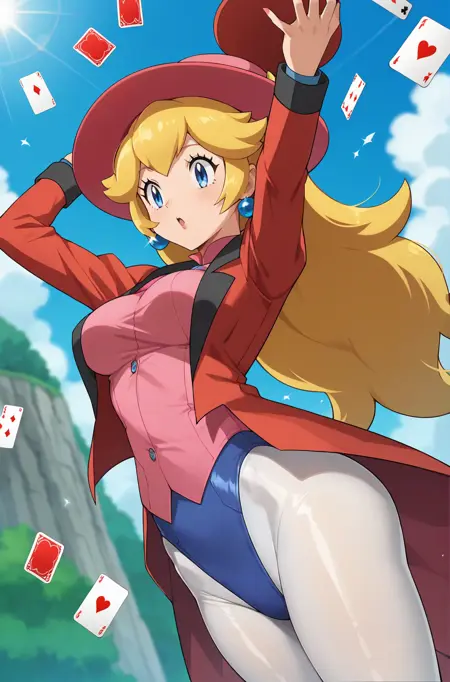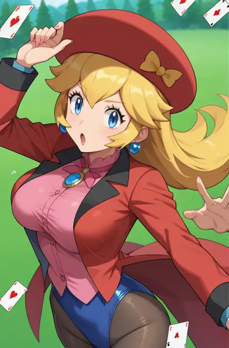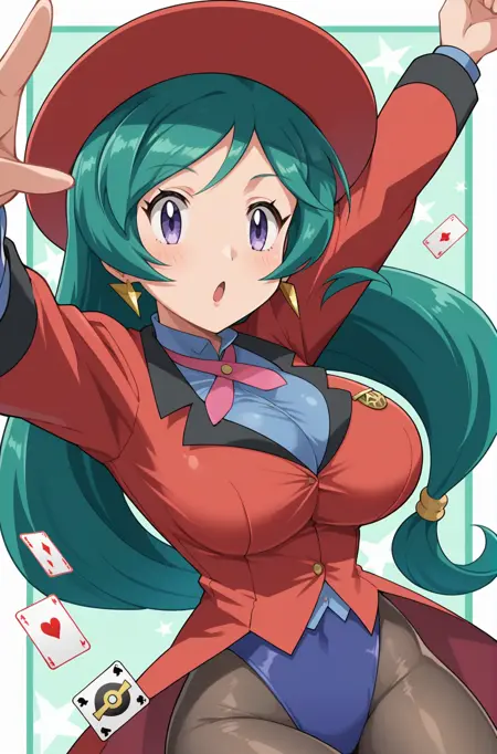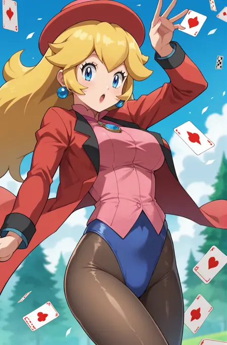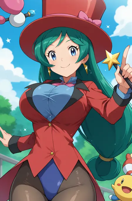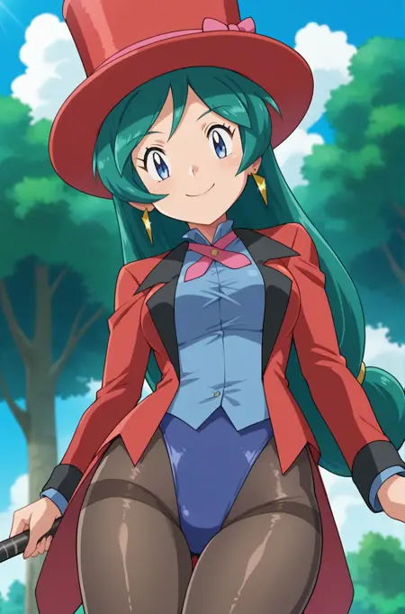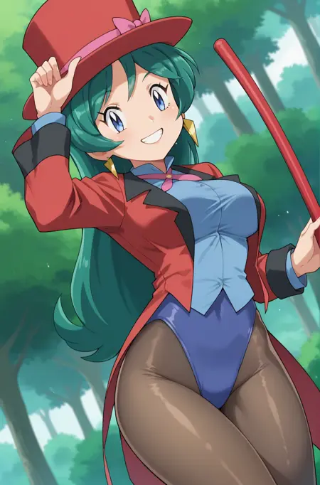 long sleeves, hat, bow, jewelry, jacket, pantyhose, earrings, high heels, leotard, coat, black pantyhose, red footwear, red jacket, brown pantyhose, top hat, wand, blue leotard, coattails, tailcoat