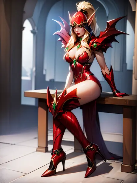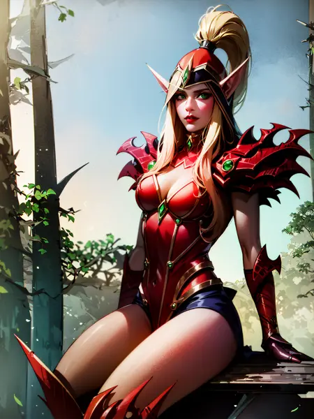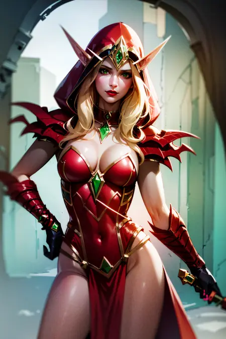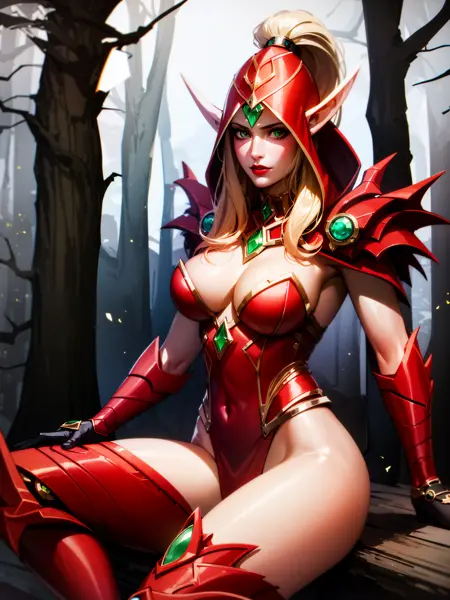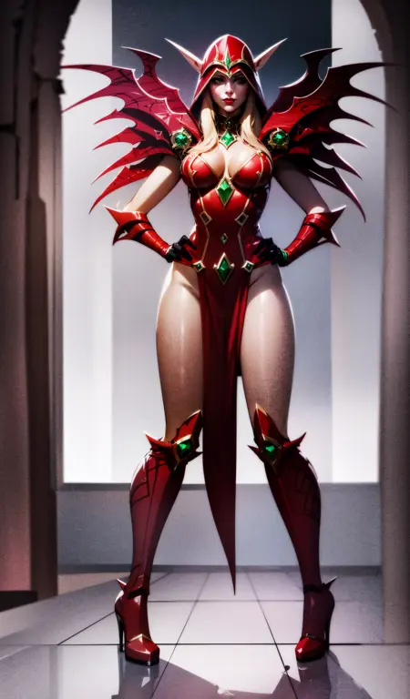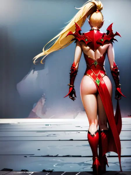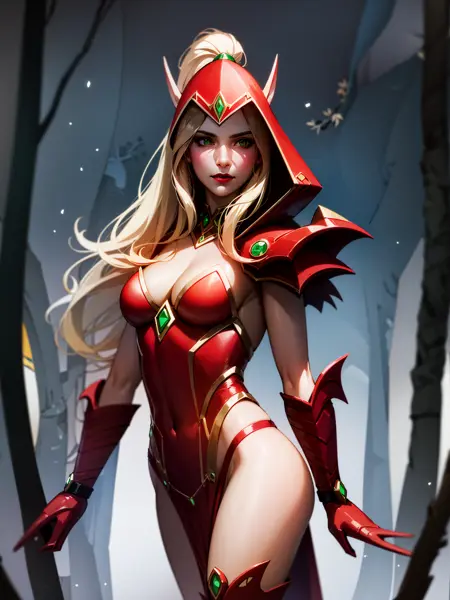 如想获得经典造型,可在正向提示词中添加 hood on, red leotard, pelvic curtain。
