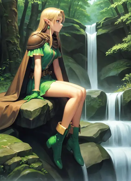 头环、耳环、斗篷、肩甲、短裙、肩包、手套、腰带、绿色靴子