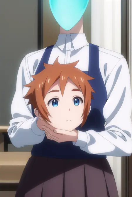 kyouko machi, short hair, blue eyes, brown hair, fire, blue fire, (disembodied head:1.5), (holding head:1.5),