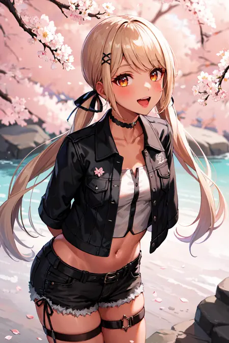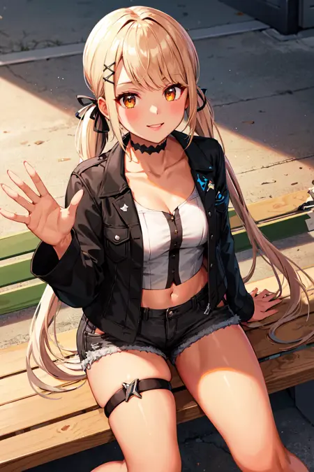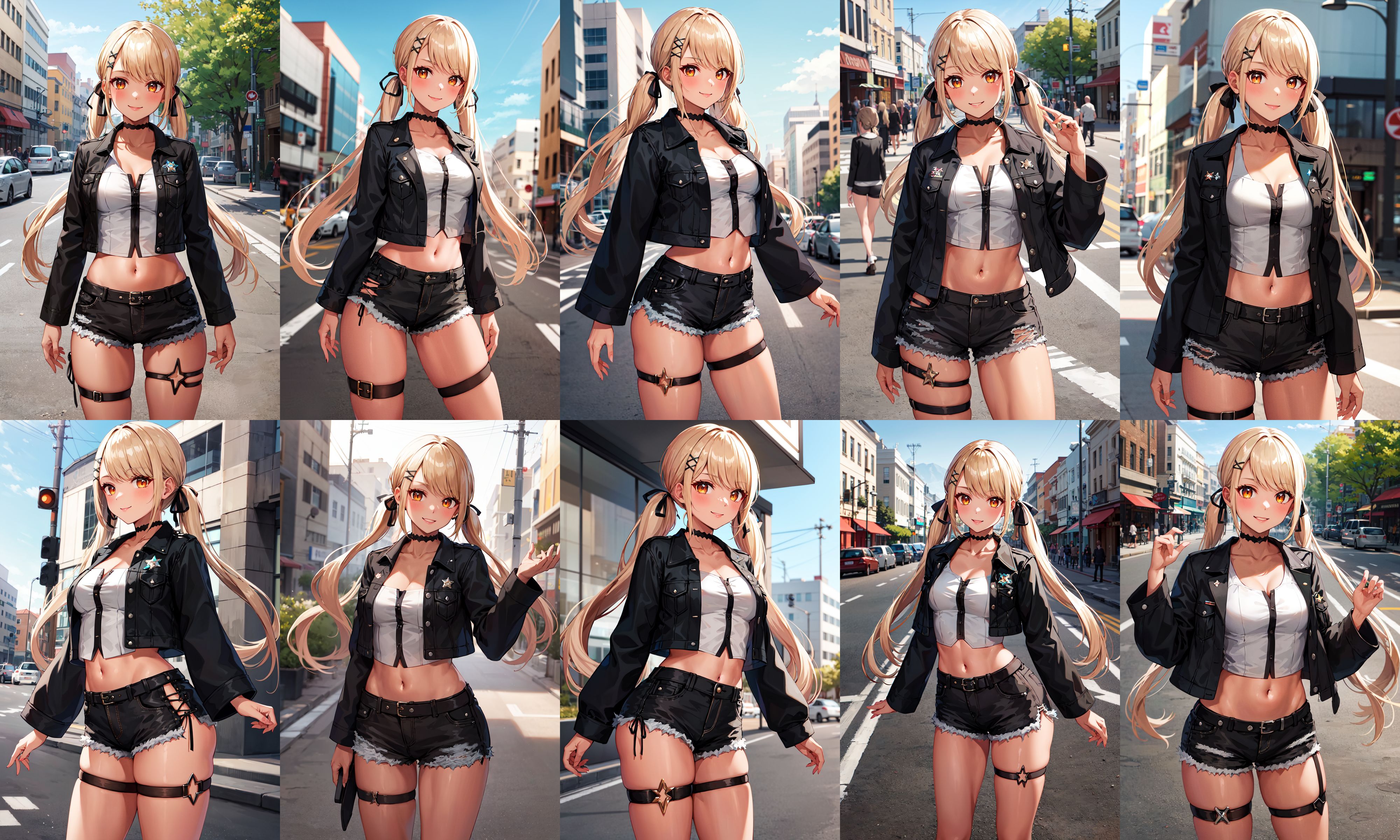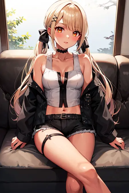 outfit1aaqpi, long hair, low twintail, hair ribbon, hairclip, medium breasts, choker, cropped jacket, black jacket, white shirt, midriff, black shorts, thigh strap
