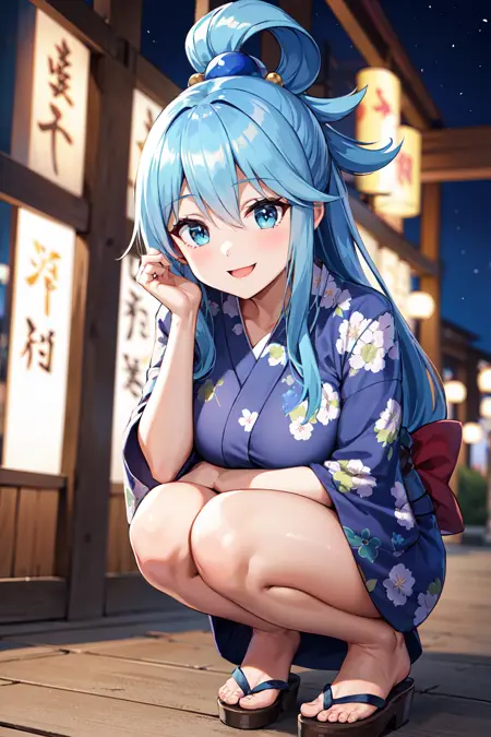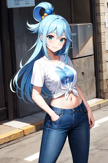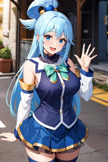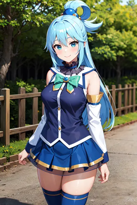 服装1aaaqua, 长发, 蓝发, 发圈, 发饰, 项圈, 裸露肩膀, 绿色蝴蝶结, 蓝色衬衫, 分离袖子, 蓝色裙子, 过膝袜