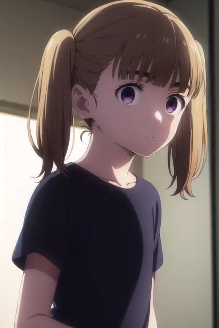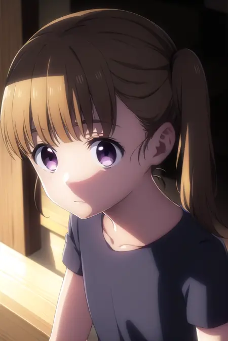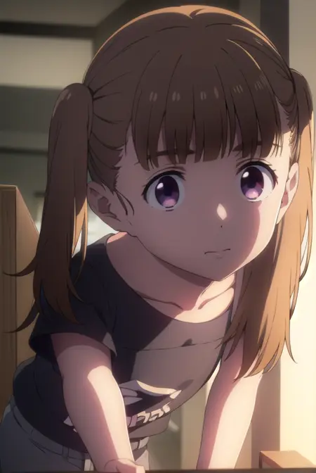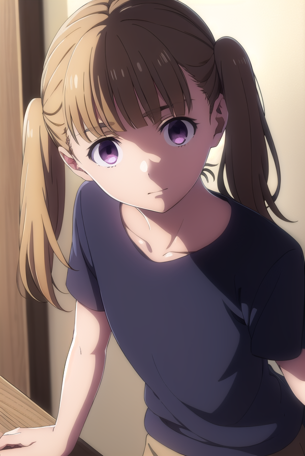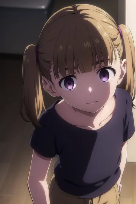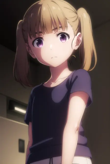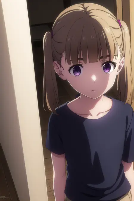 shiori kobayakawa, bangs, brown hair, twintails, (purple eyes:1.1), blunt bangs, empty eyes,