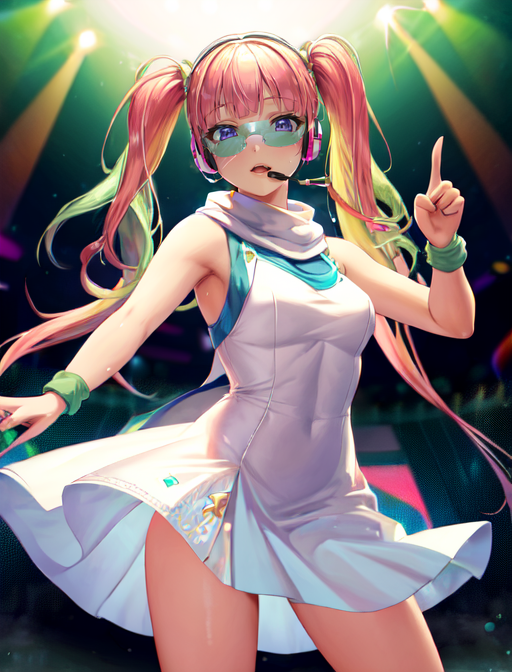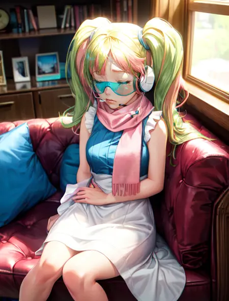 Additional words that may help: twintails, (two-toned hair, blonde hair:3, pink hair, green hair, split bangs), forehead, goggles, tinted eyewear, headset, white and blue dress, sleeveless dress, scarf,