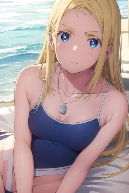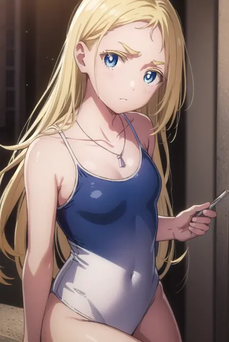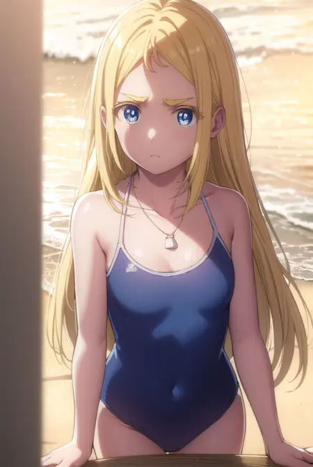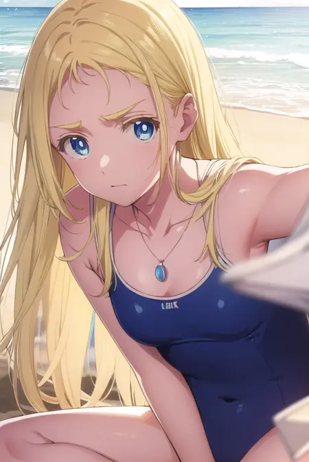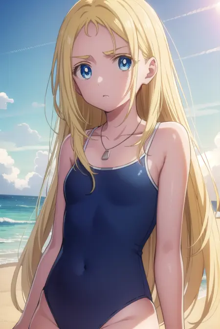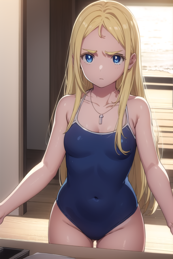 ushio kofune, long hair, blue eyes, blonde hair, very long hair, straight hair, (forehead:1.2),