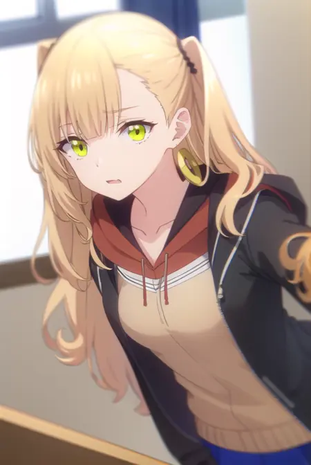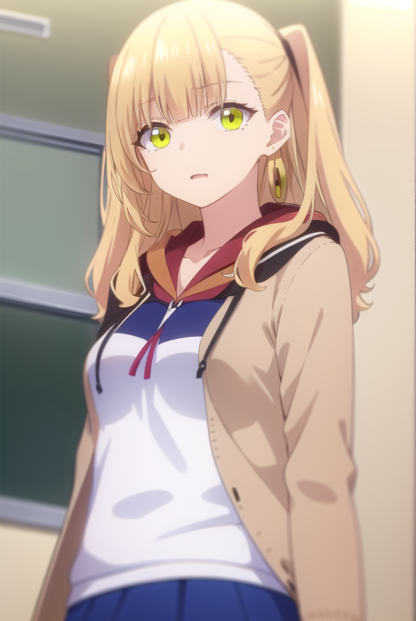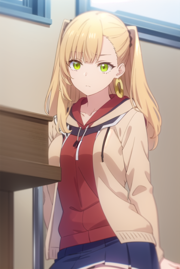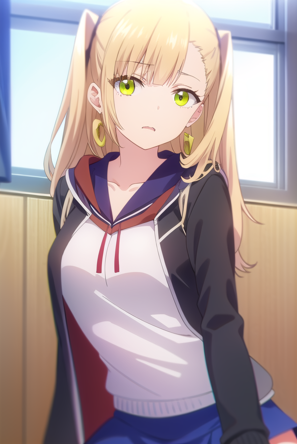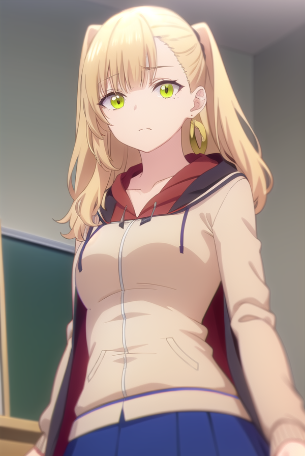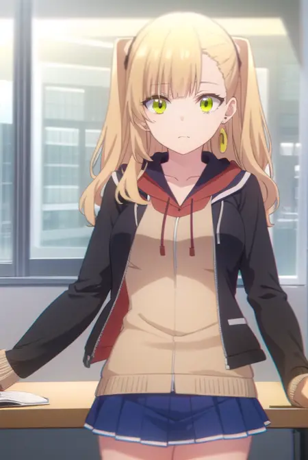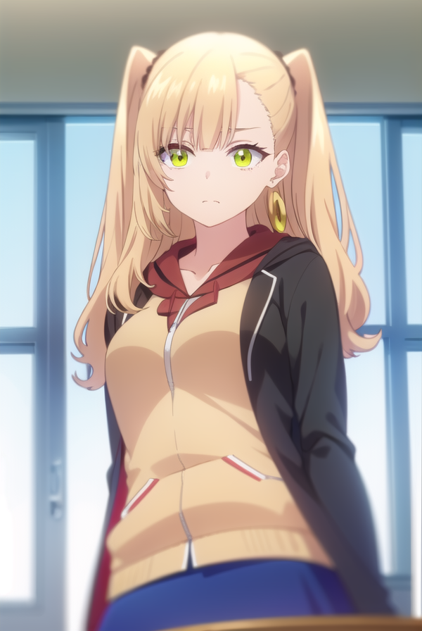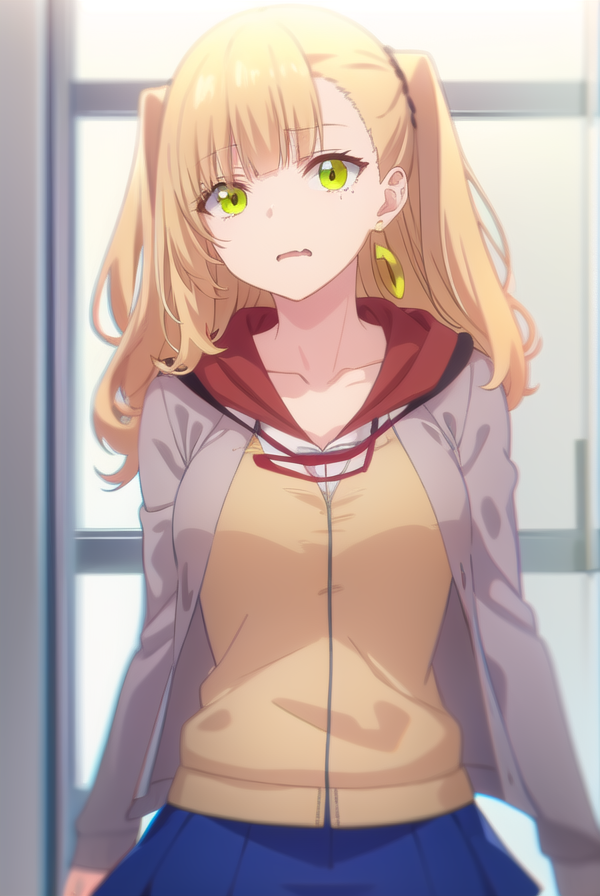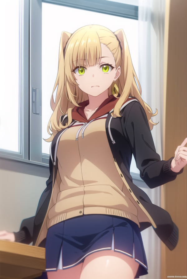 mike nekotani, long hair, bangs, blonde hair, (green eyes:1.3), fang, two side up,