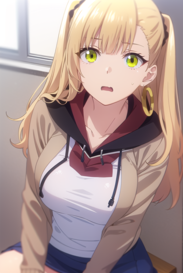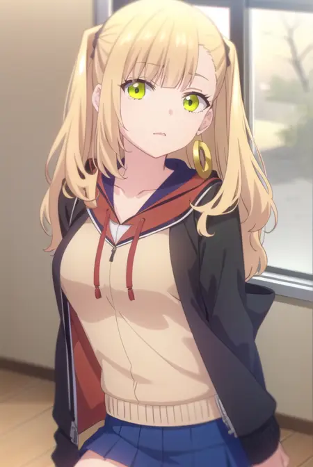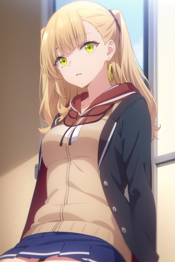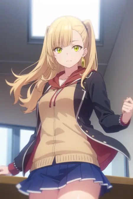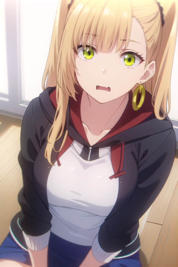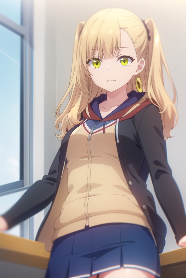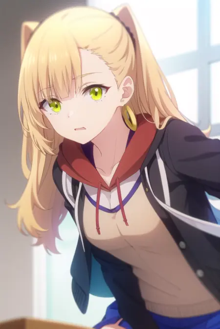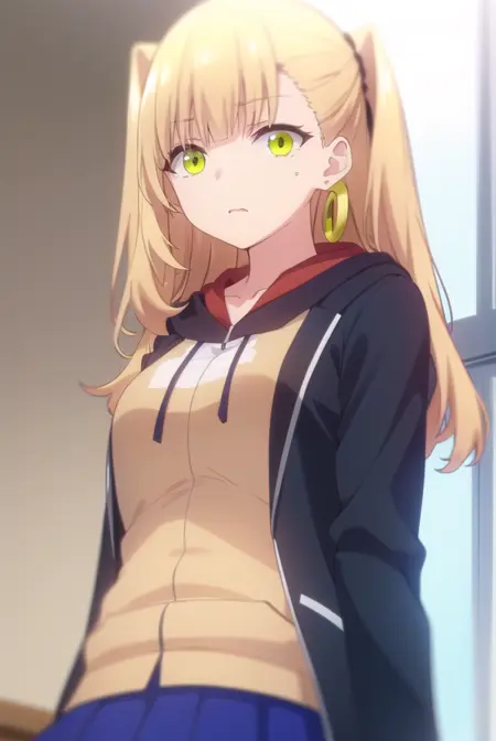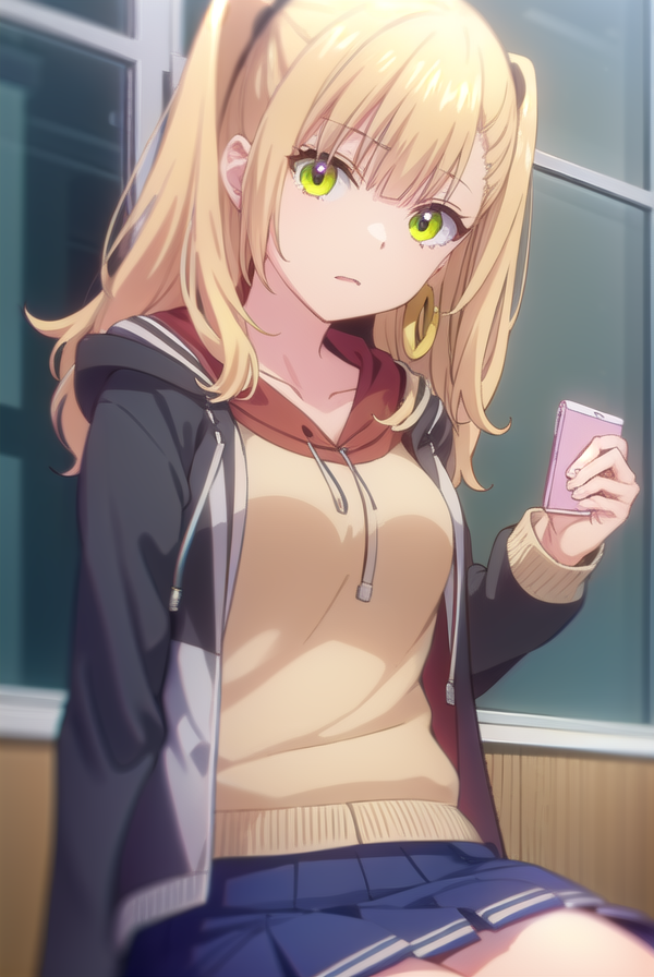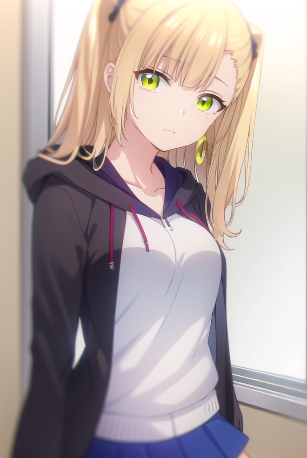 skirt, jewelry, jacket, earrings, open clothes, hood, miniskirt, black skirt, blue skirt, hoodie, cardigan, open cardigan,