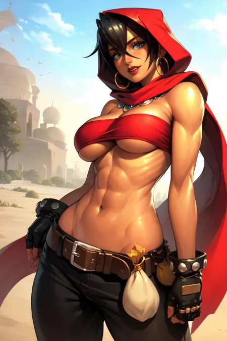 후프 귀걸이, 후드, 스카프, 목걸이, 빨간 튜브 탑, 손가락 없는 장갑, 벨트, 벨트 주머니, 바지, 부츠