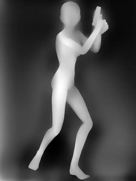 Openposeのボーン画像、線画、そして深度マップを使ったセットで、キャラクターがハンドガンを持った3つの異なるポーズを表現します。