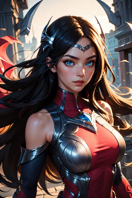 irelia, 1girl, 바디수트, 어깨 노출, 이마 보호대, 머리 장식, 갑옷