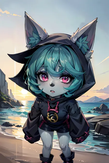 Other useful positive tags: 1girl, solo, green hair, yordle, animal ears, bangs, hood, short hair, pink eyes, grey skin, colored skin, shiny, ears through headwear, long sleeves, furry