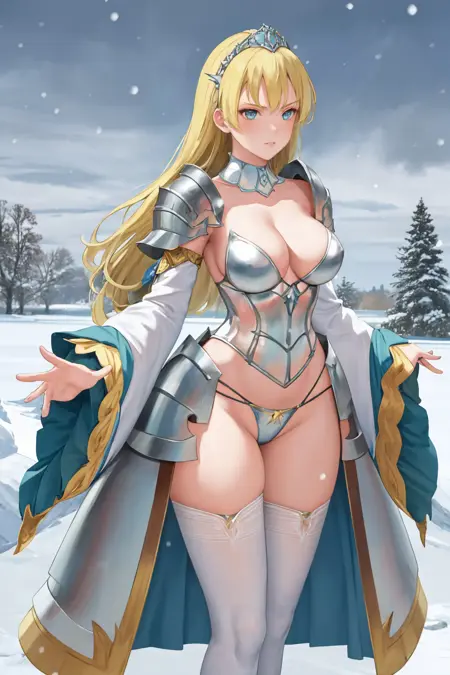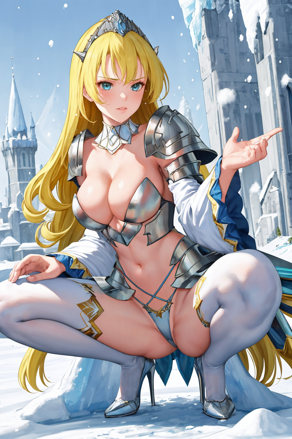 qbcinderella, long hair, tiara, detached collar, armor, bikini armor, pauldrons, wide sleeves, frilled sleeves, showgirl skirt, white thighhighs