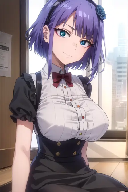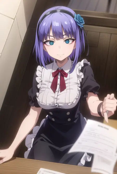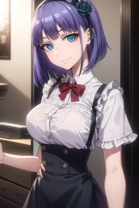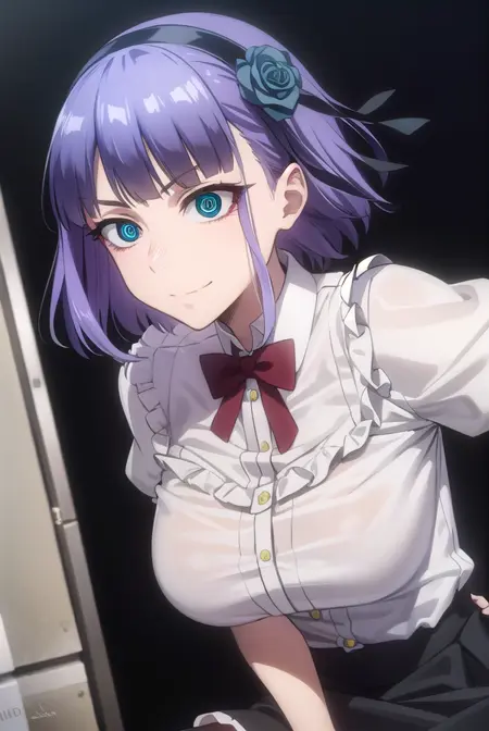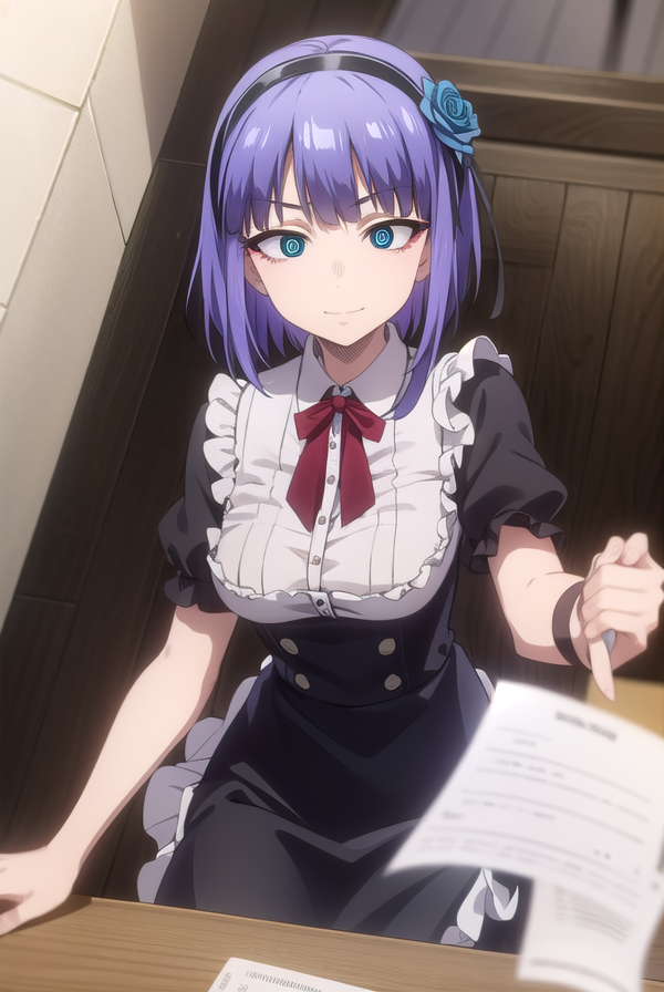 hotaru shidare, short hair, blue eyes, hair ornament, purple hair, flower, hairband, hair flower, (ringed eyes:1.5),