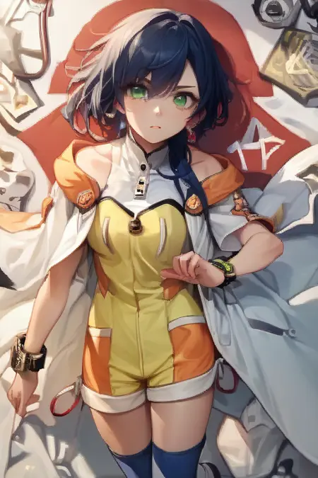普通服装:fabia_Sheen, blue_hair, long_hair, green_eyes, pink ear rings, white_coat, bare_shoulder, yellow_shirt, short_sleeves, shorts, yellow_shorts, orange_patches, blue thighhigh socks, white boots, wristwatch,