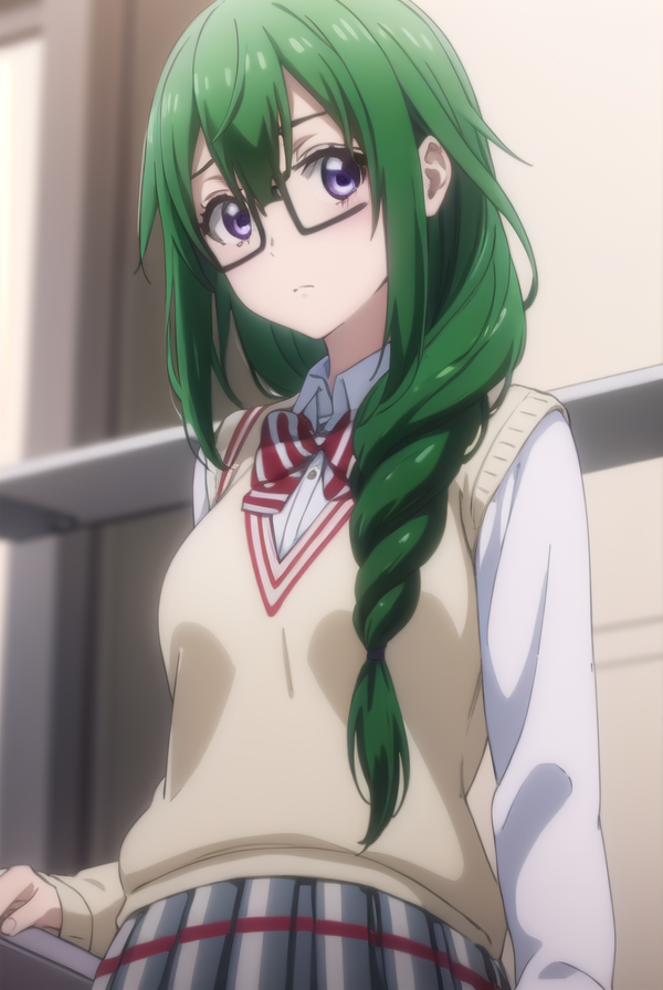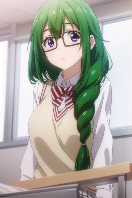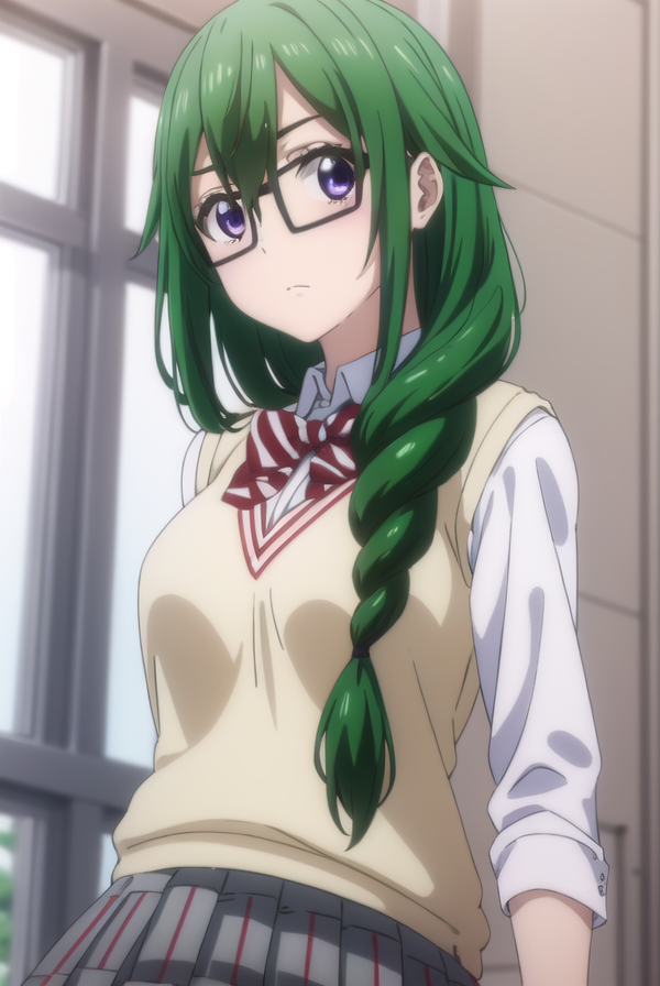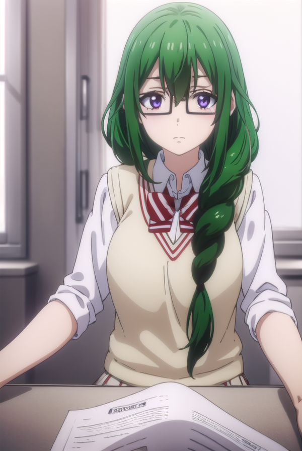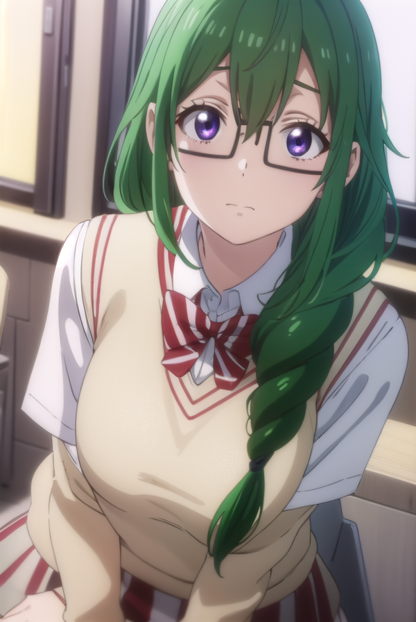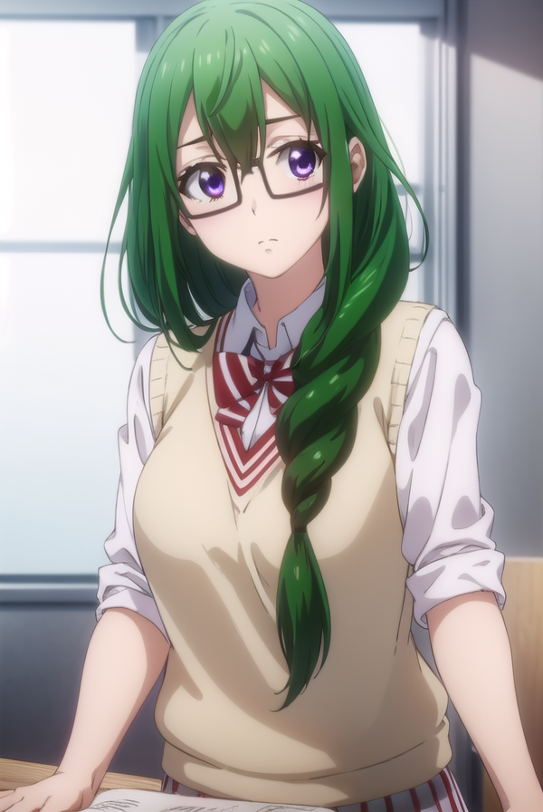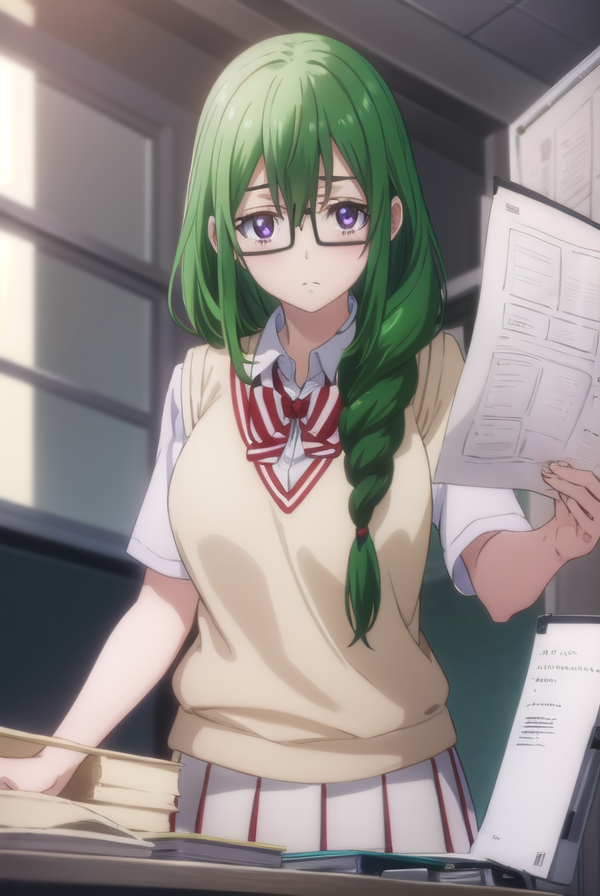 meiko ootsuka, long hair, (purple eyes:1.1), green hair, glasses, black-framed eyewear, hair over shoulder, braid, single braid,