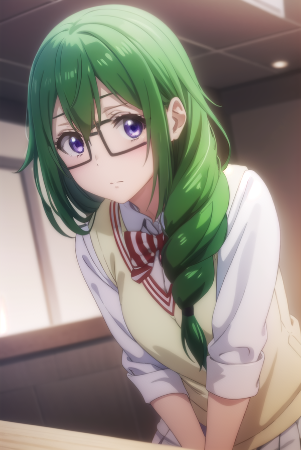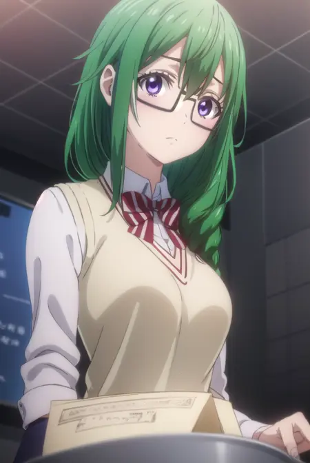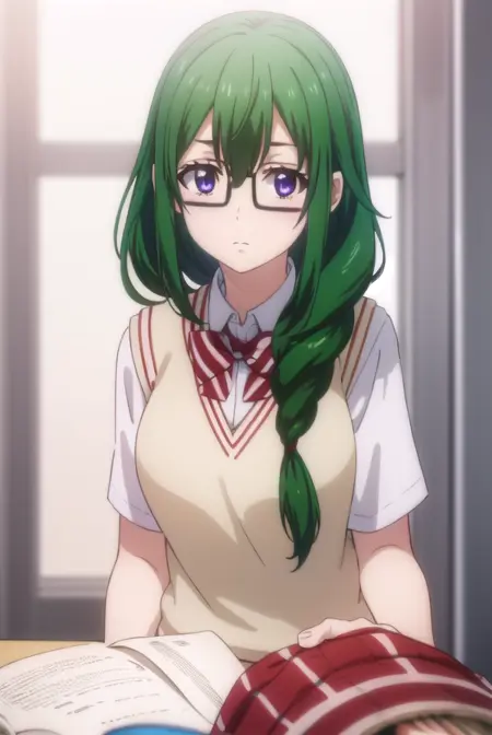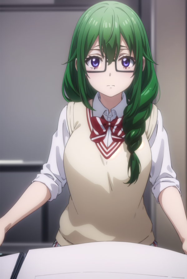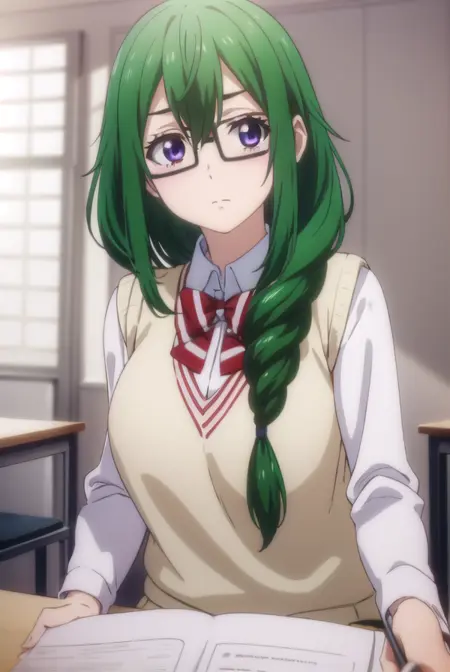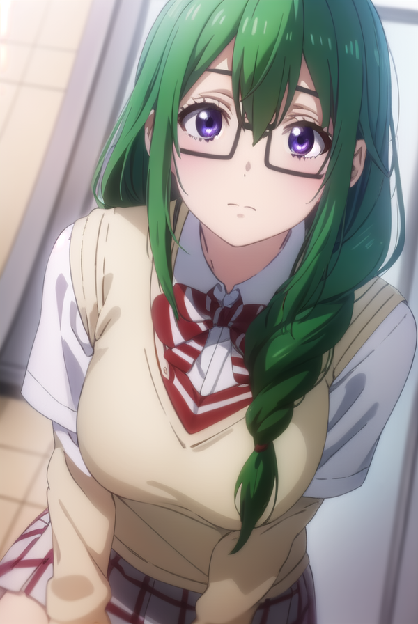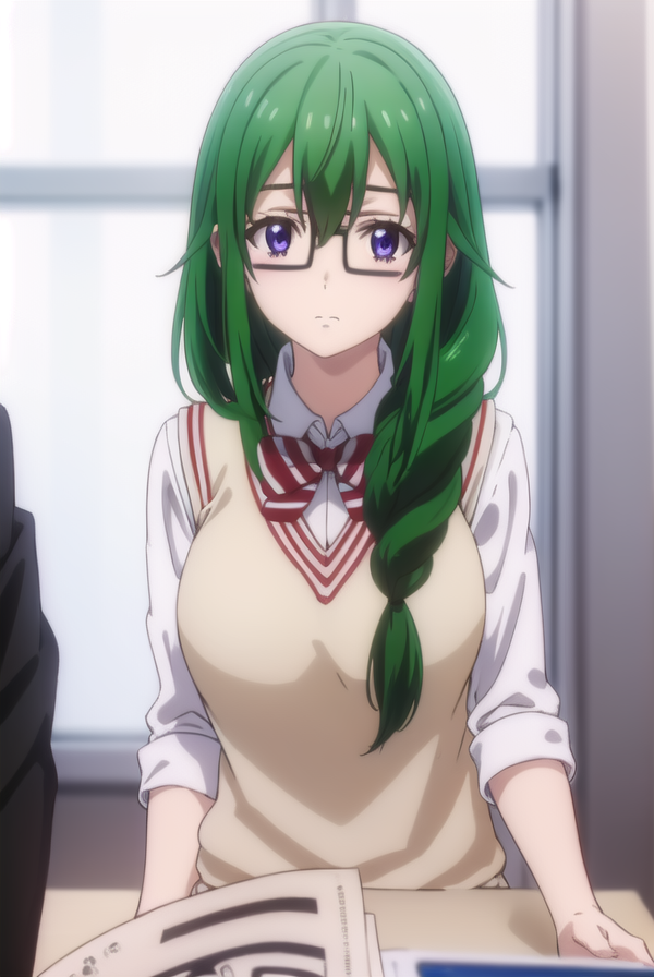 meiko ootsuka, long hair, (purple eyes:1.1), green hair, glasses, black-framed eyewear, hair over shoulder, braid, single braid,