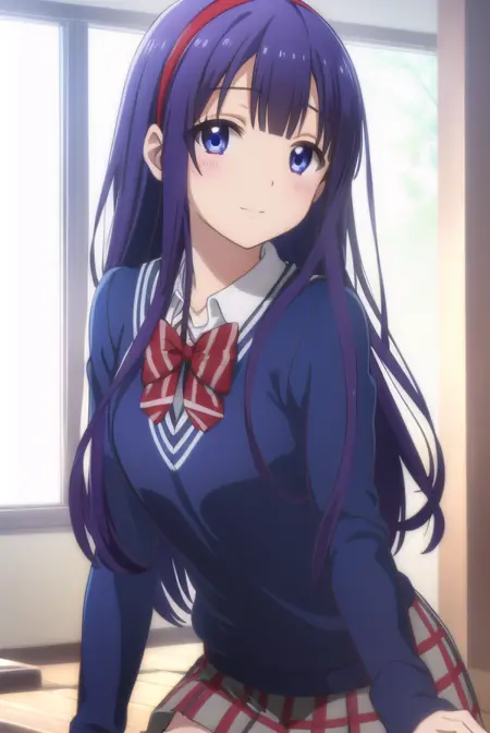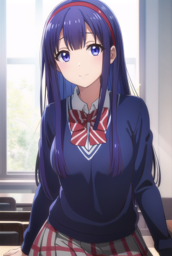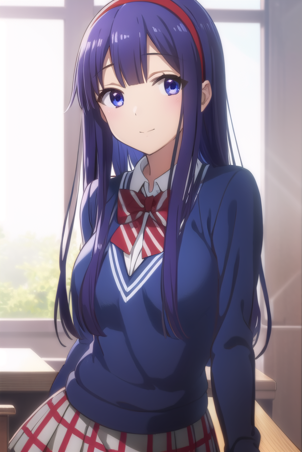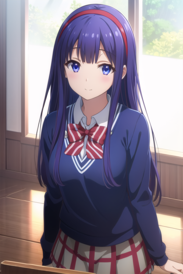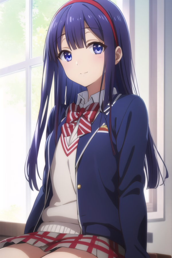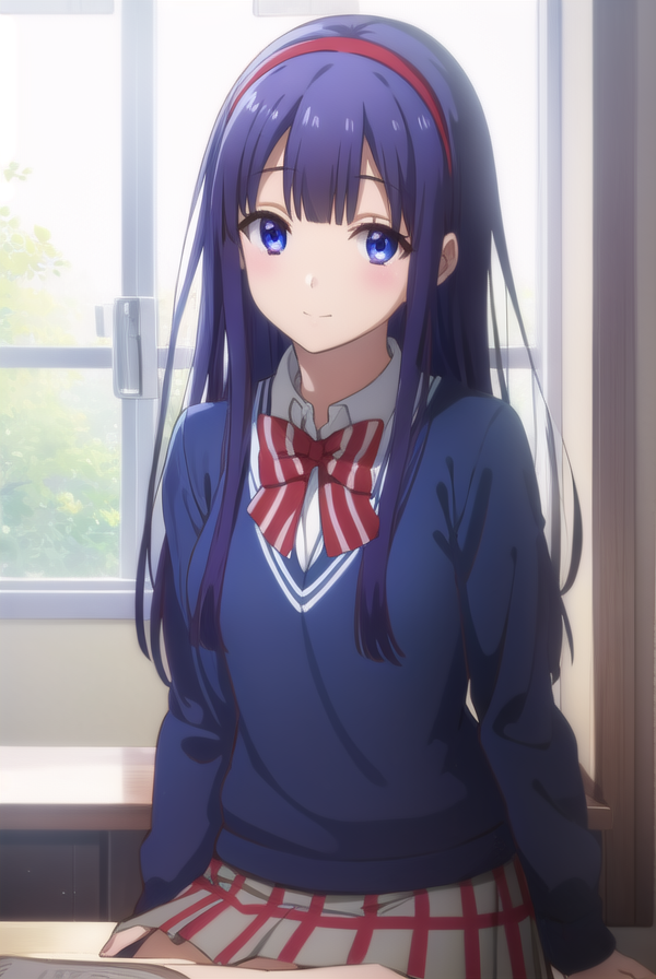 mikoto asuka, long hair, blue eyes, blue hair, hairband, red hairband,