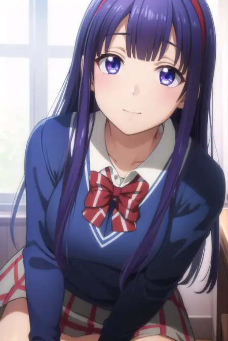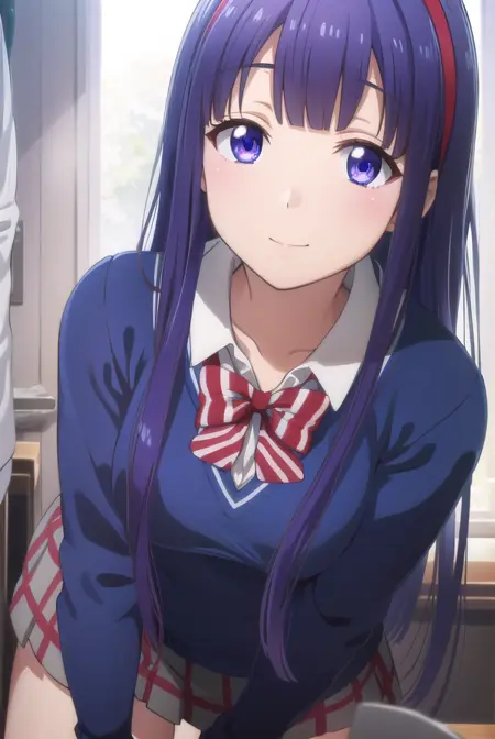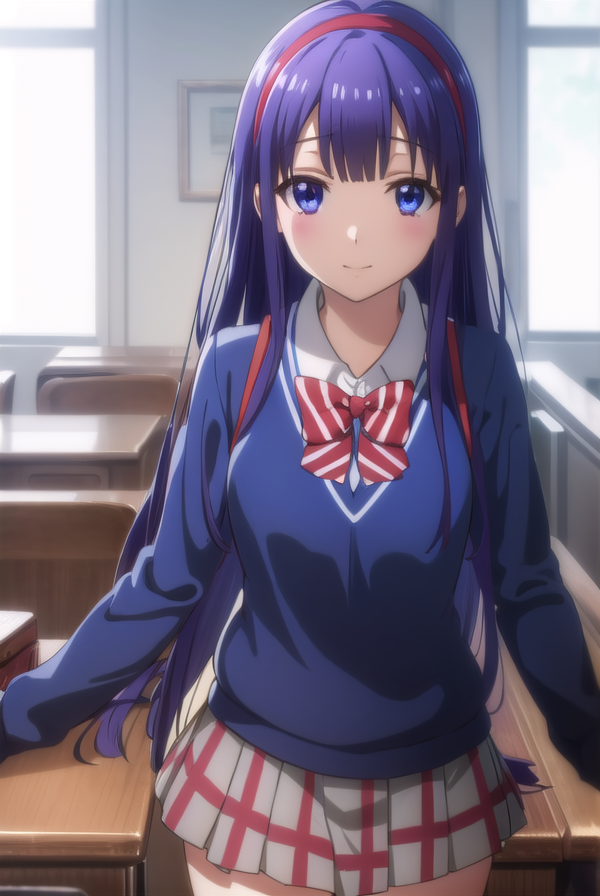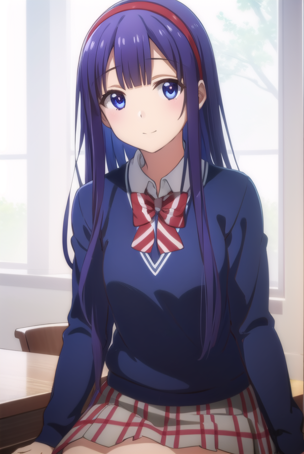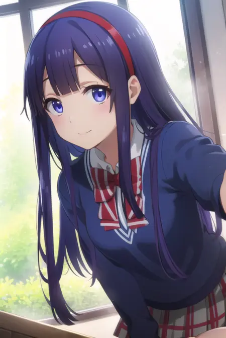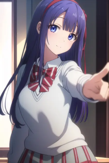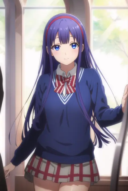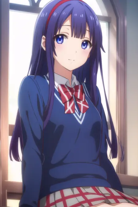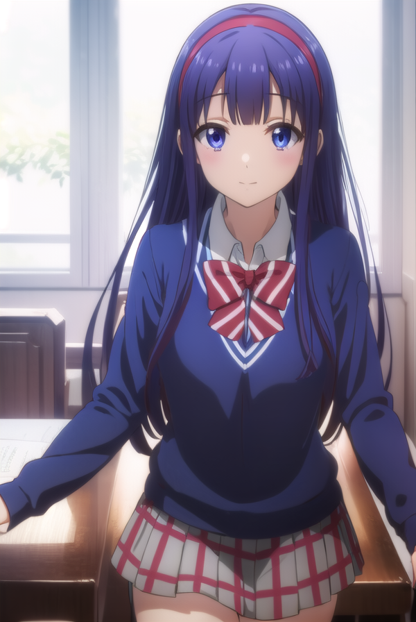mikoto asuka, long hair, blue eyes, blue hair, hairband, red hairband,