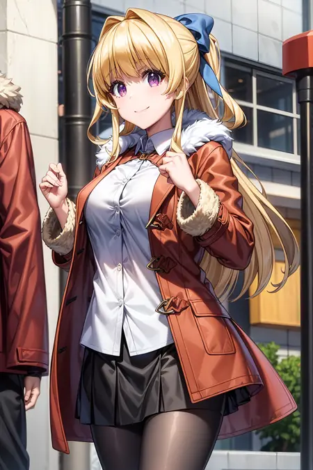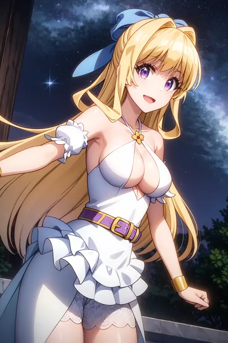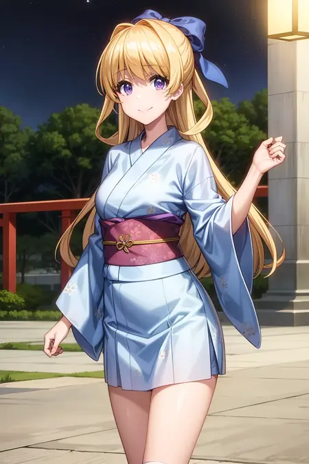 long hair, blonde hair, purple eyes, hair bow, blue bow