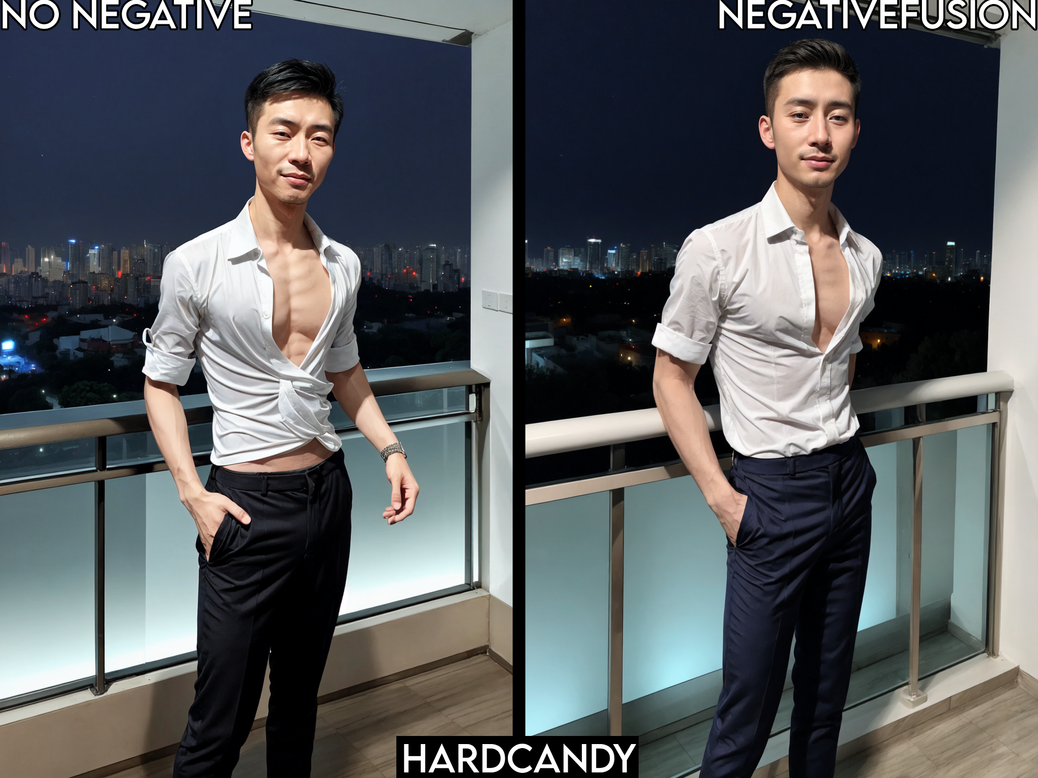 NegativeFusion was created solely to help reduce deformities and boost saturation and facial clarity in my models without leading to harsh results when inpainting. While this model was only thoroughly tested with HardCandy V2 and BoyFusion for their respective versions, you should get similar results with similar photorealistic models.