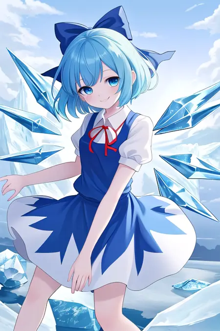 chiruno, and the recommended tags arebest quality, masterpiece, highres, solo, {chiruno:1.15}, blue_hair, bow, cirno, short_hair, hair_bow, wings, blue_eyes, ice, ice_wings, blue_bow, ribbon, smile.. - Recommended weight is 0.5-1.15.