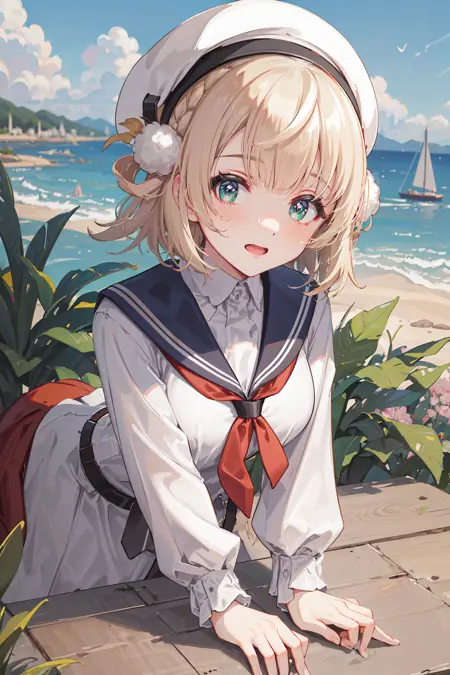 除非你想更换颜色,否则无需描述她的眼睛或头发颜色。你可以使用 red_beret、beret、pom_pom_necktie、striped_school_uniform、black_school_shoes 等词汇来描述她的“正式”服装。