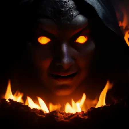 프롬프트: 어두운 공포스러운 동굴 속에 있는 과학 추상전투복을 입은 여성의 초상, 왁자烛불 조명, UHD, 8K