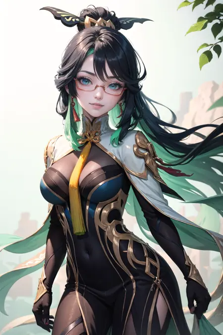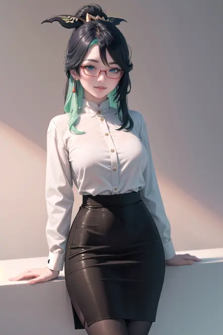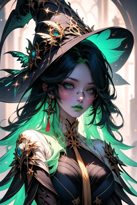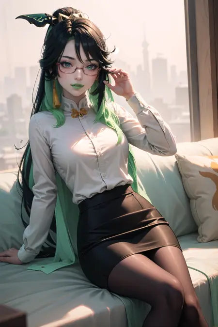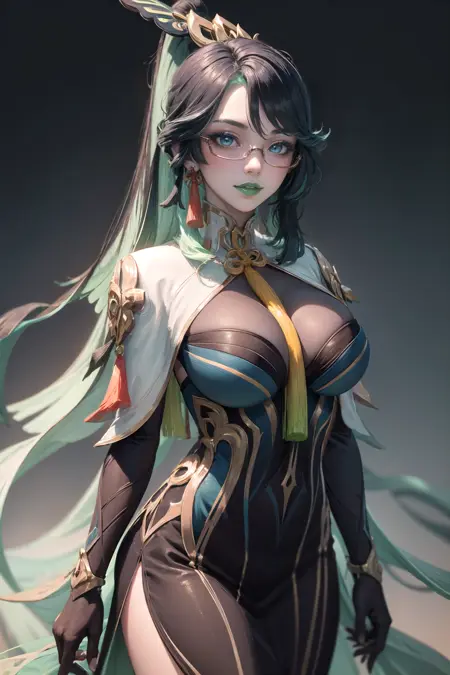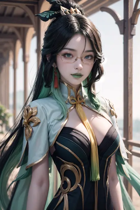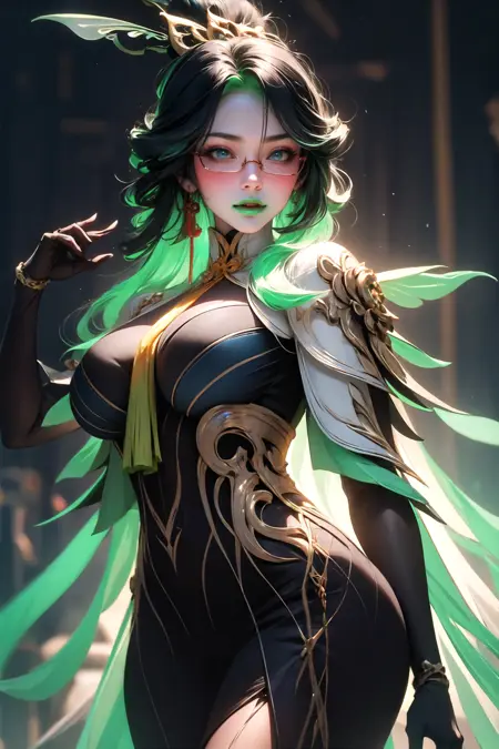 Additional: makeup, green lips, under-rim eyewear, pelvic curtain