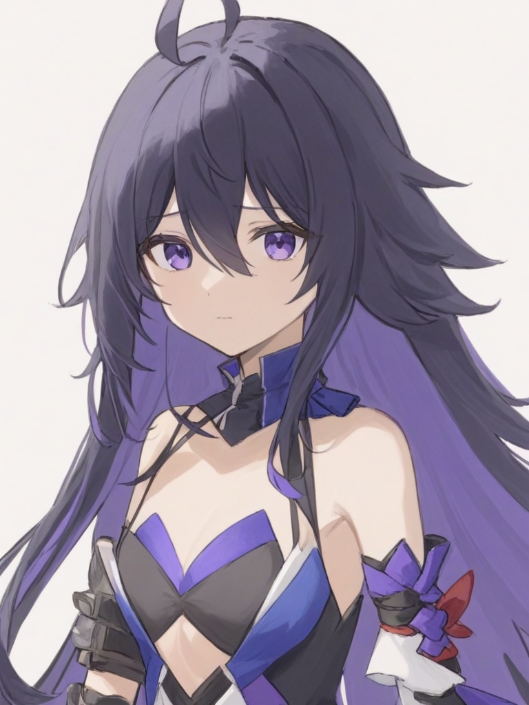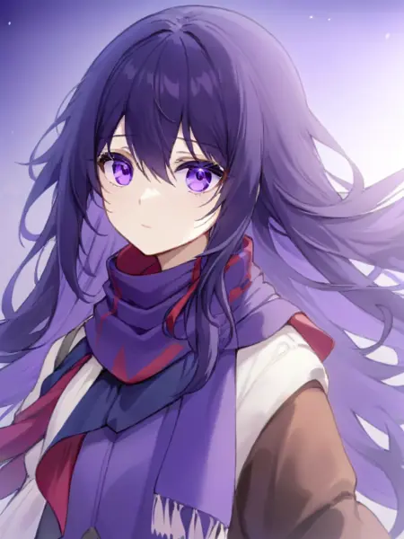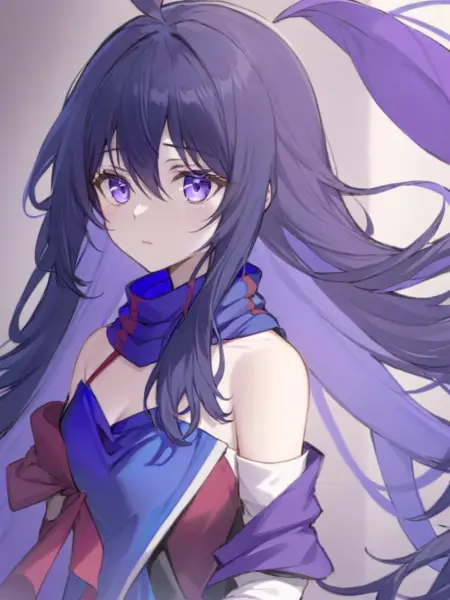 触发词:long_hair,bangs,purple_scarf,blue_eyes,hair_between_eyes,ahoge,purple_hair,scarf,blue_hair,bare shoulder,
