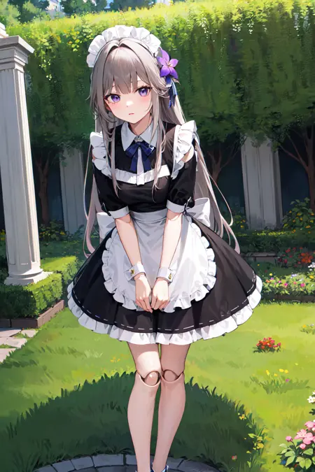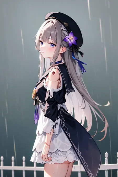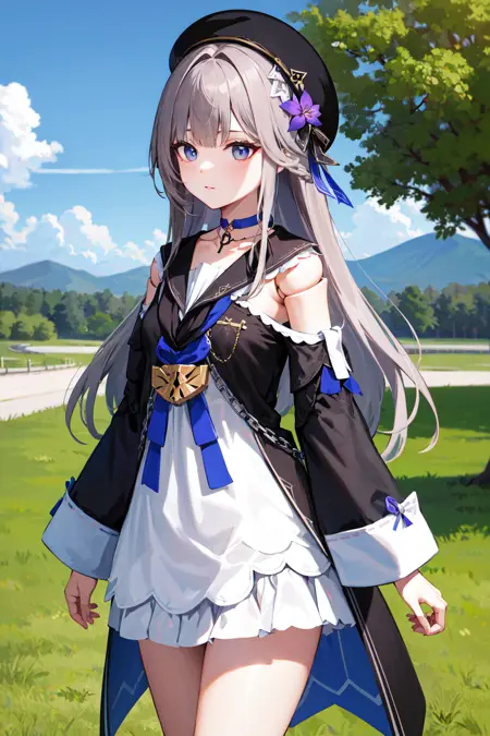 아우트핏1aaherta, 긴 머리, 회색 머리, 머리에 꽃, 베레모, 검은 머리 장식, 관절, 초커, 열쇠, 선원색 목선, 어깨 절개, 흰 드레스, 분리된 소매