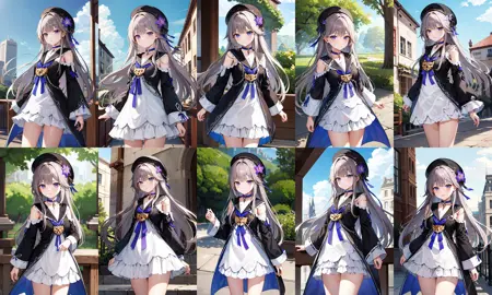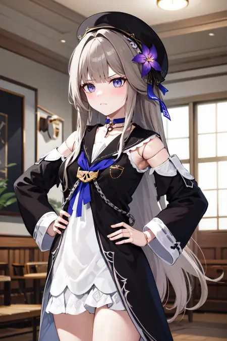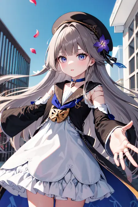aaherta, long hair, grey hair, hair flower, beret, black headwear, joints, choker, key, sailor collar, shoulder cutout, white dress, detached sleeves