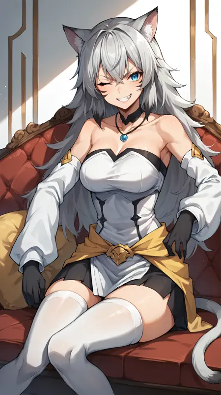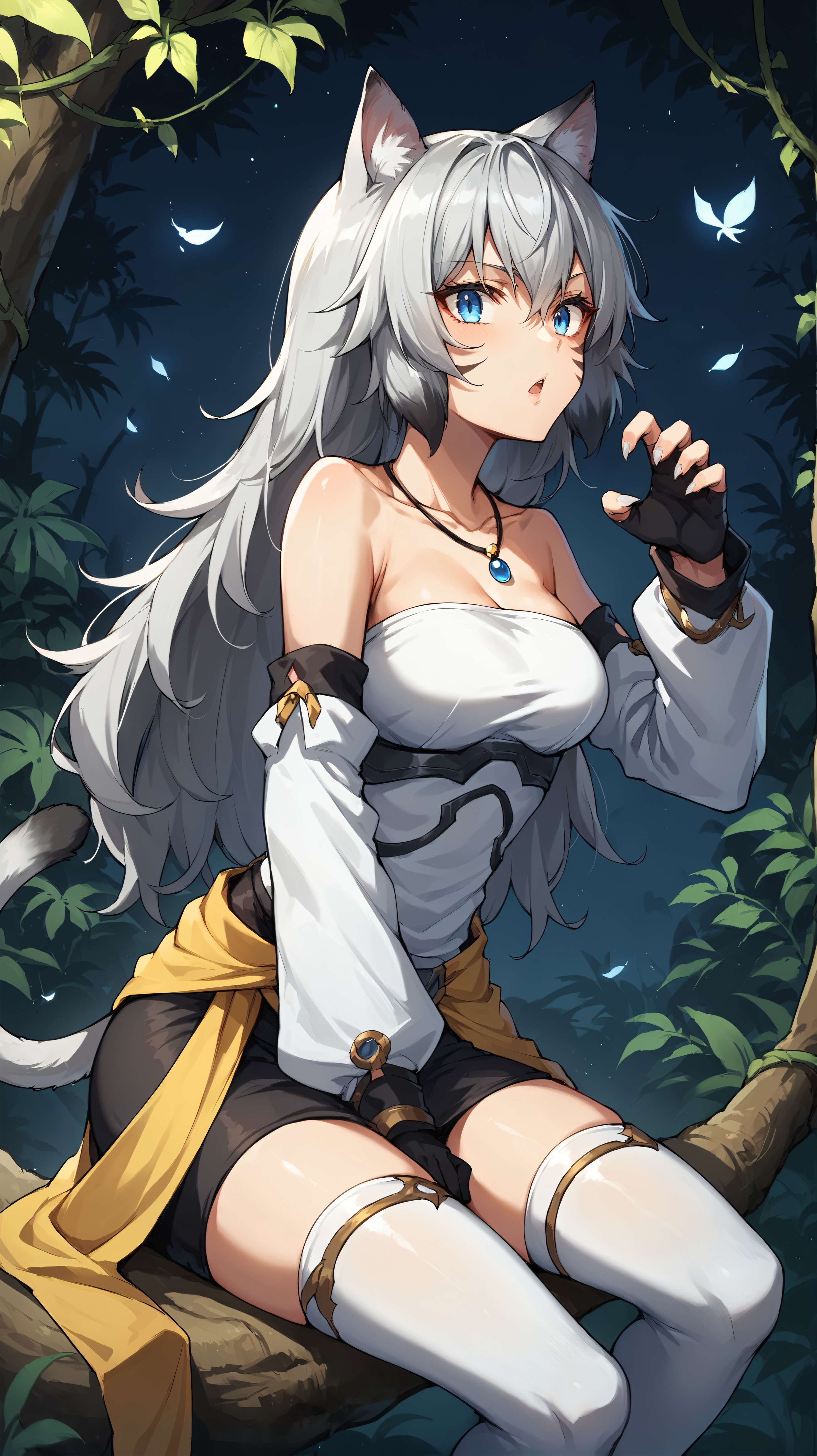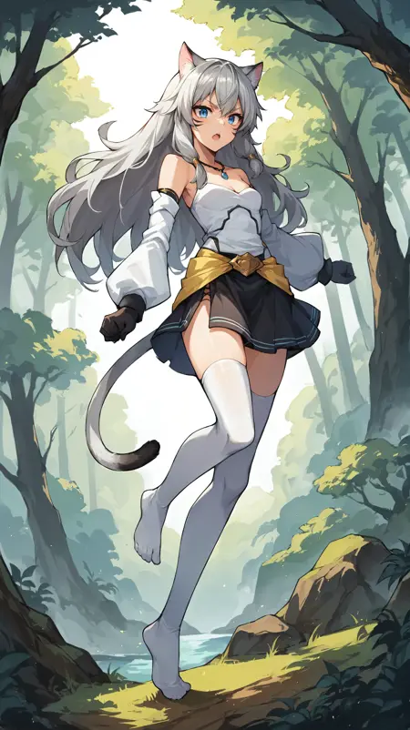white shirt, long hair, gray hair, cat ears, blue eyes, necklace, yellow waist cape, detached sleeves, face markings, black miniskirt, (white thighhighs:1.3), cat tail, black gloves