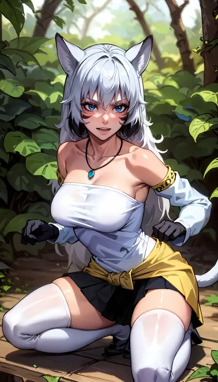 白色衬衫,长发,灰发,猫耳,蓝眼,项链,黄色腰披,分体袖子,面部纹路,黑色迷你裙,(白色过膝袜:1.3),猫尾,黑色手套
