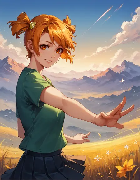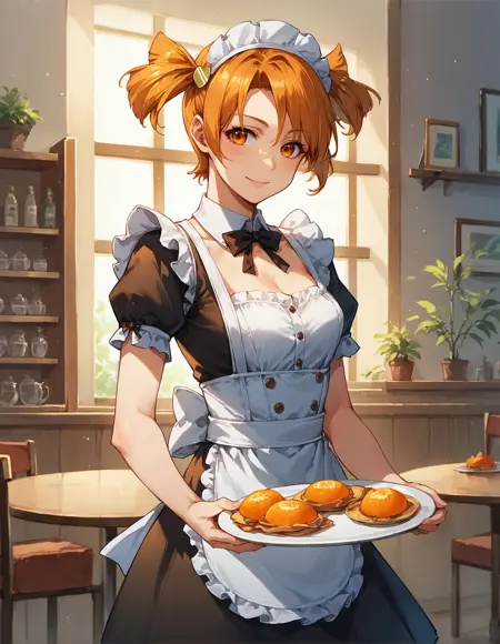 외모: 주황색 머리, 짧은 트윈테일, 주황색 눈, 노란 헤어클립