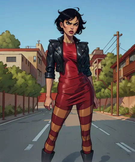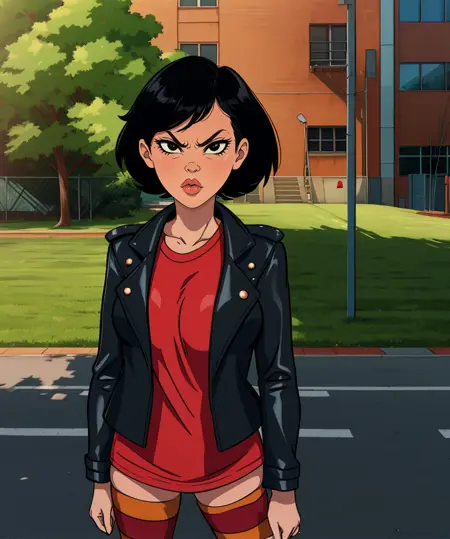 beanie, red shirt, leather jacket, long sleeves, - striped thighhighs, or striped legwear, boots,