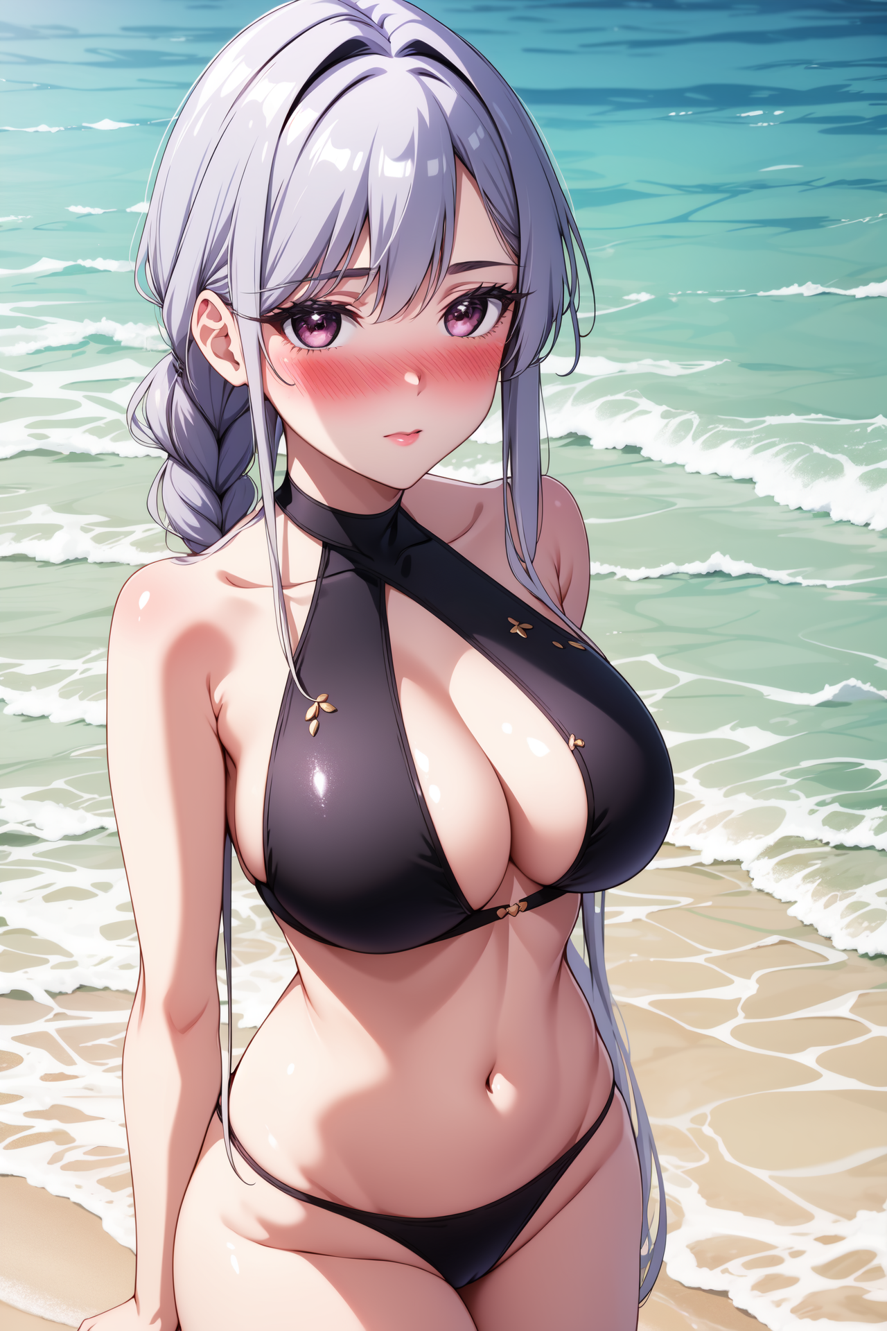 bikini: nano eiai, grey hair, single braid, braided ponytail, long sidelocks, black purple bikini, halterneck, cleavage cutout, bare shoulders, cleavage, navel, groin,