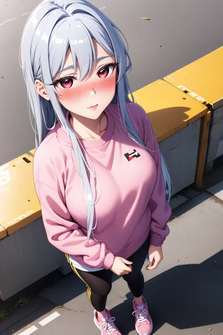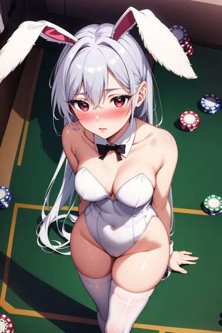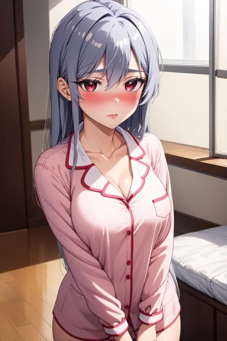 1**- nano eiai, long hair, bangs, hair between eyes, red eyes, grey hair,**