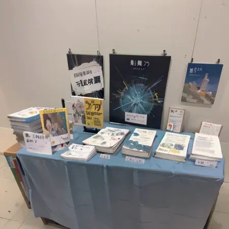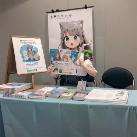 提示(同人社团摊位/サークルのスペース:桌子周围):comiket, 桌子, 椅子, 书籍, 室内, 拍摄背景, 室内,