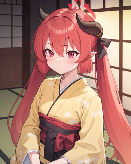 1girl, solo, 긴 머리, 앞머리, 눈 사이의 머리카락, 트윈테일, 빨간 머리, 일본 복장, 뿔, 뾰족한 귀, 기모노, V, 환상, 노란 기모노, junko (blue archive)