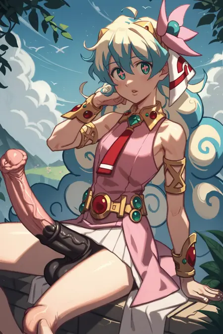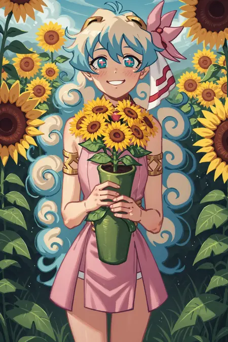 | 训练词汇 | beautiful anime eyes, aqua eyes, cross-shaped pupils, symbol-shaped pupils, + +, blonde hair, long hair, curly hair,multicolored hair, nia teppelin, two-tone hair, hair flower, hair ornament, long hair, curly hair, tengen toppa gurren lagann, <lora:niaTeppelin:0.8> pink dress, jewelry, pink dress, red necktie, armlet, bare legs,已复制! |