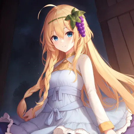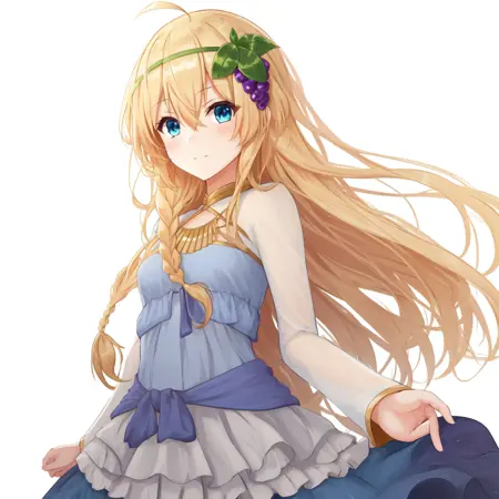 1个女孩,独奏,金发,长发,头发遮住眼睛,蓝眼睛,呆毛,辫子,发饰,葡萄,蓝色连衣裙,长袖,渐变连衣裙,层叠连衣裙,连衣裙,